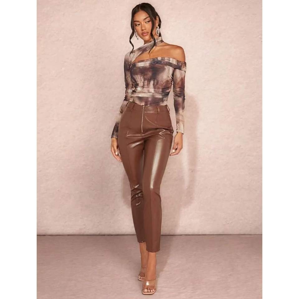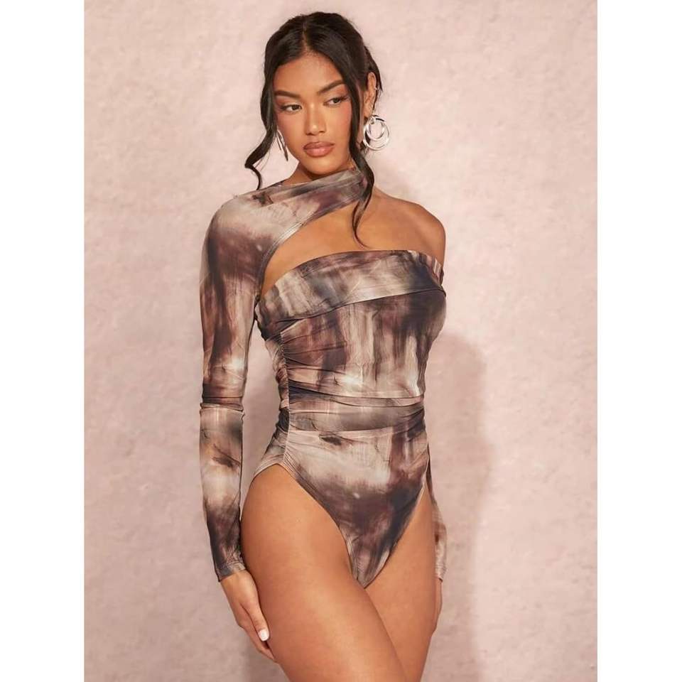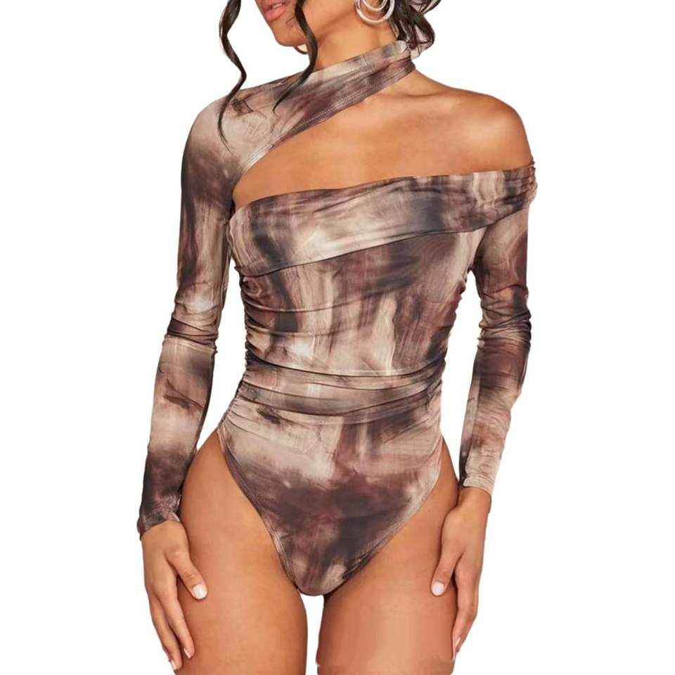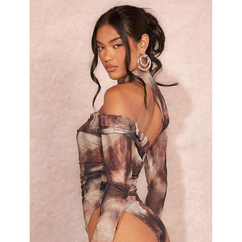บอดี้สูทผู้หญิงแบบเปิดไหล่ แขนยาว พิมพ์ลาย ผ้าถักยืด รุ่นคัสตอม 2026 เหมาะสำหรับใส่ออกไปข้างนอก