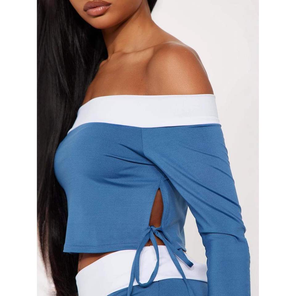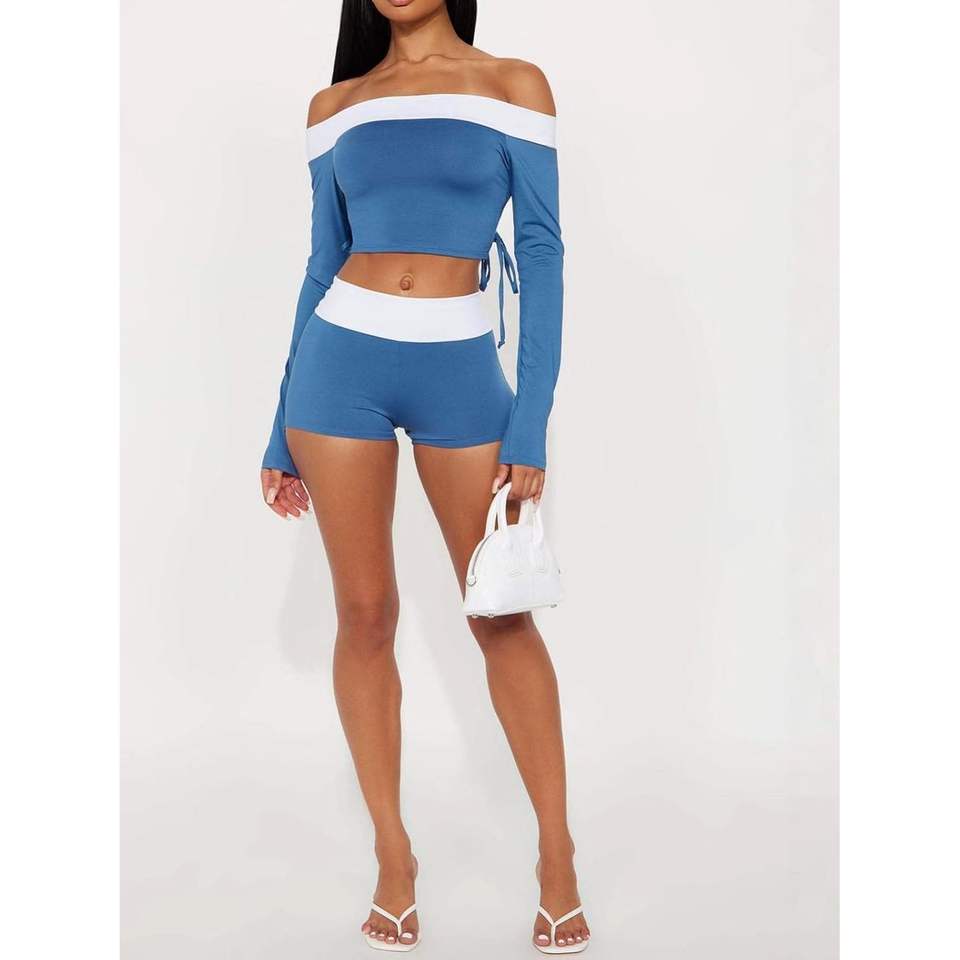 ชุดเซ็ตเสื้อครอปแขนยาวเปิดไหล่และกางเกงขาสั้นสำหรับผู้หญิง รุ่นคัสตอม 2026 สีน้ำเงินขาวตัดกัน แต่งเชือกผูก เหมาะสำหรับออกกำลังกาย