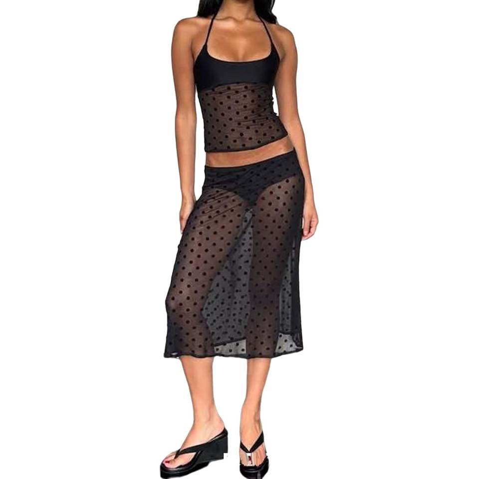 Custom 2026 Women's Polka Dot Mesh Halter Crop Top And See Through Maxi Skirt Set Natural Waist Straight Silhouette Club Dress