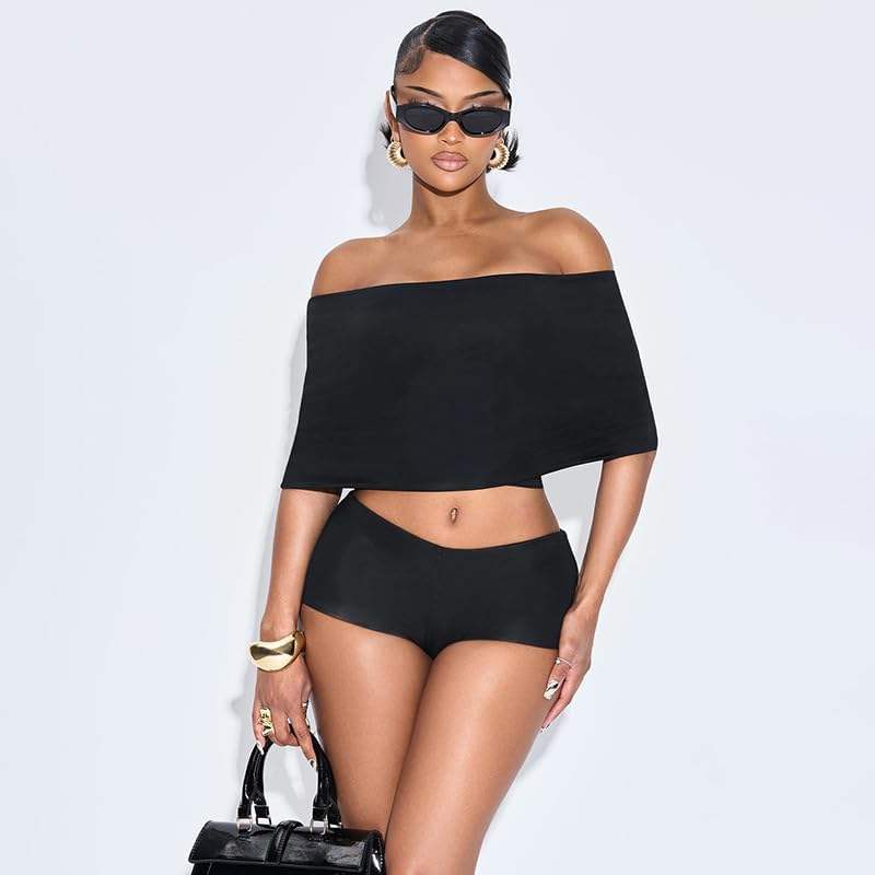 ชุดเซ็ตเสื้อครอปเปิดไหล่และกางเกงขาสั้นสำหรับผู้หญิง รุ่นคัสตอม 2026 เซ็กซี่ ไร้แขน ไร้สาย ถักนิตติ้ง เหมาะสำหรับใส่ไปเที่ยวคลับในฤดูใบไม้ผลิและฤดูร้อน