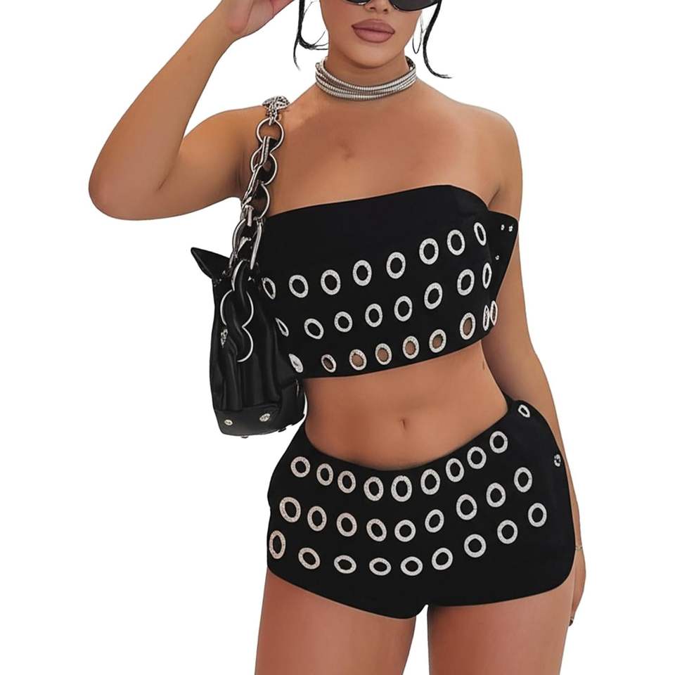 Custom 2026 Women's Two Piece Set Off Shoulder Top And Shorts Y2K Style Breathable Spandex Polyester Knitting Hole Decoration