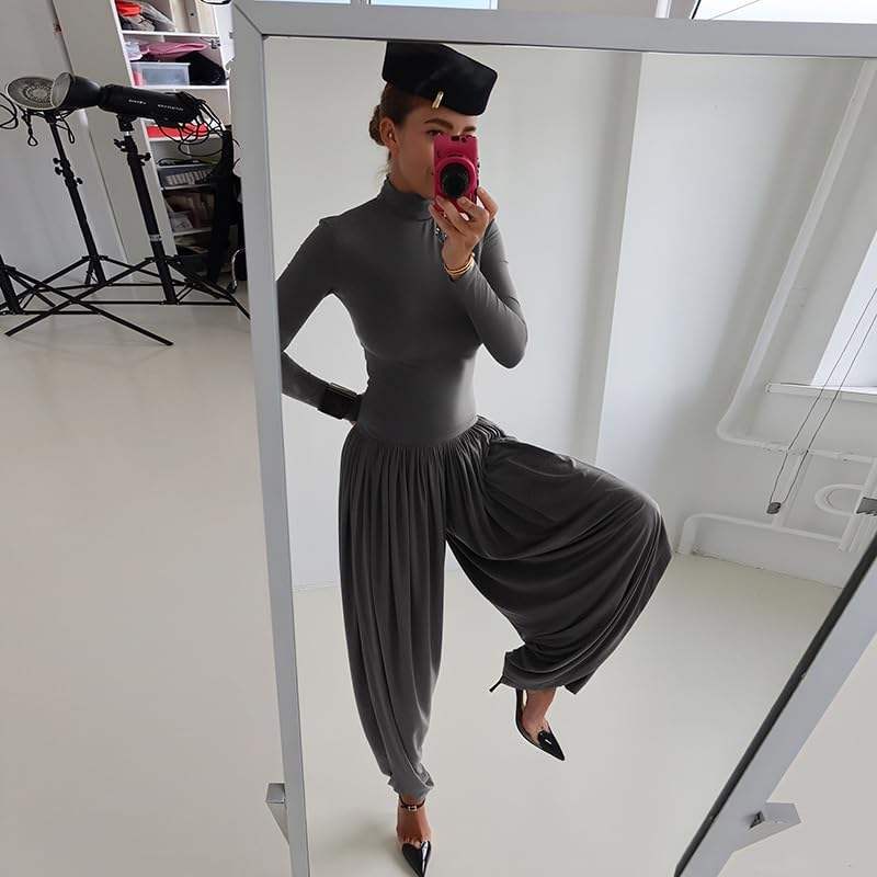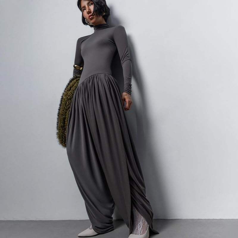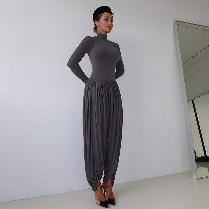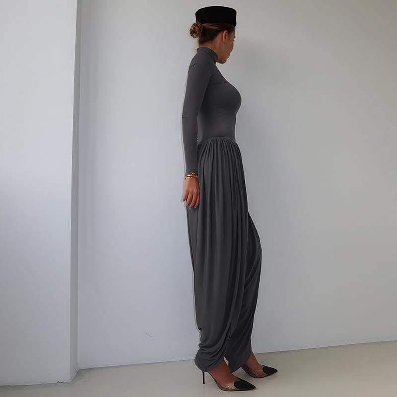จั๊มสูทผู้หญิงแบบสั่งทำพิเศษ ปี 2026 คอสูง แขนยาว จับจีบแบบอสมมาตร ชุดเดรสทรงหลวมสำหรับออกงานกลางคืน