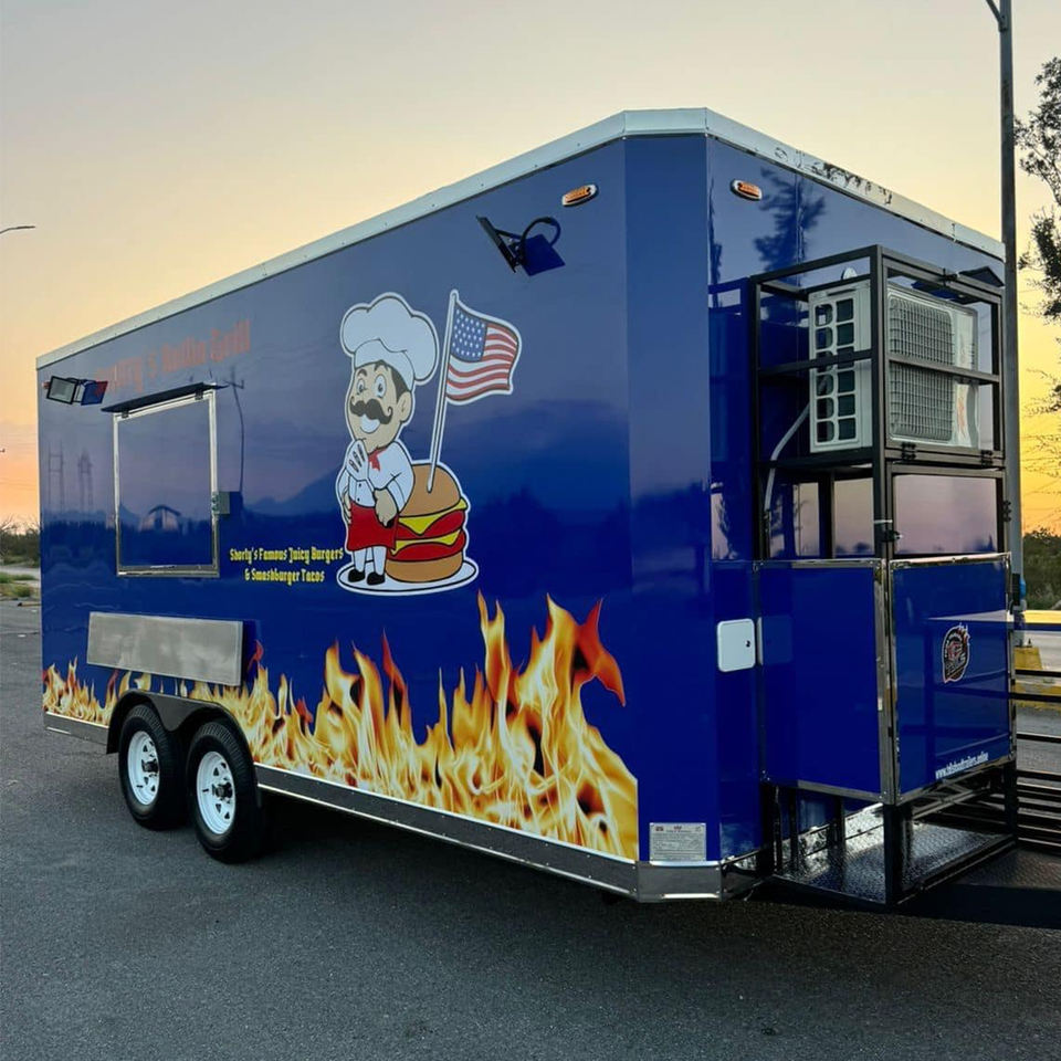 รถเทรลเลอร์ไฟเบอร์กลาสอาหารจานด่วนสแตนเลส220V แบบเคลื่อนที่ได้กำหนดเองสำหรับใช้ในครัวไอศครีมพิซซ่า