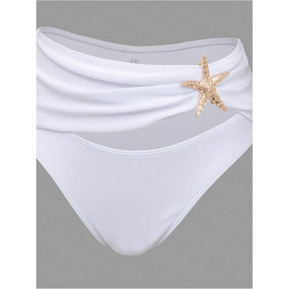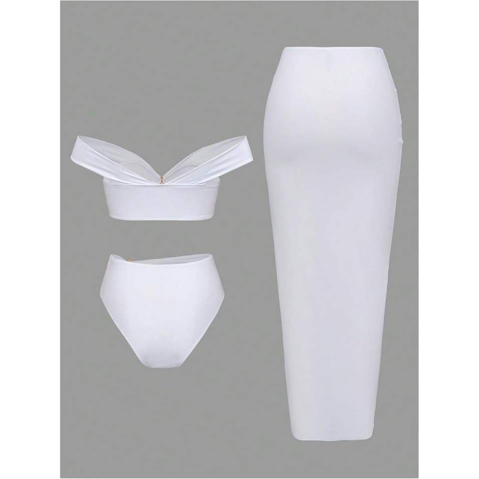 ชุดว่ายน้ำแบบ 3 ชิ้นสำหรับผู้หญิง ชุดบิกินี่แบบเปิดไหล่ พร้อมกระโปรงคลุม ผ้าสแปนเด็กซ์ ไนลอน ยืดหยุ่นได้