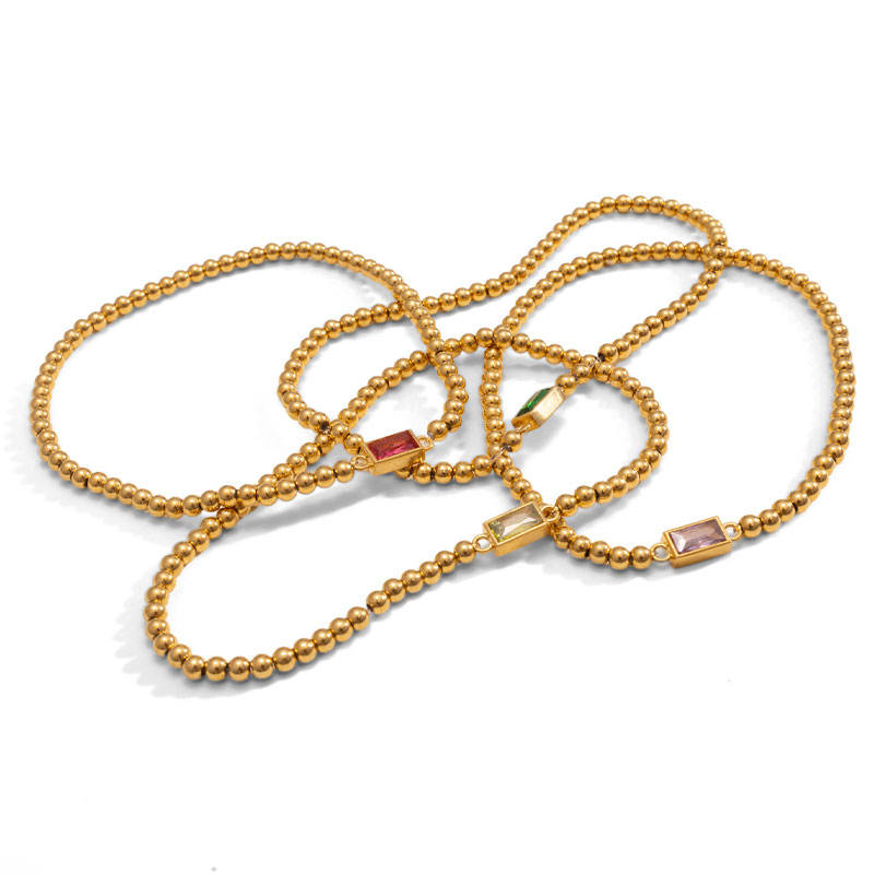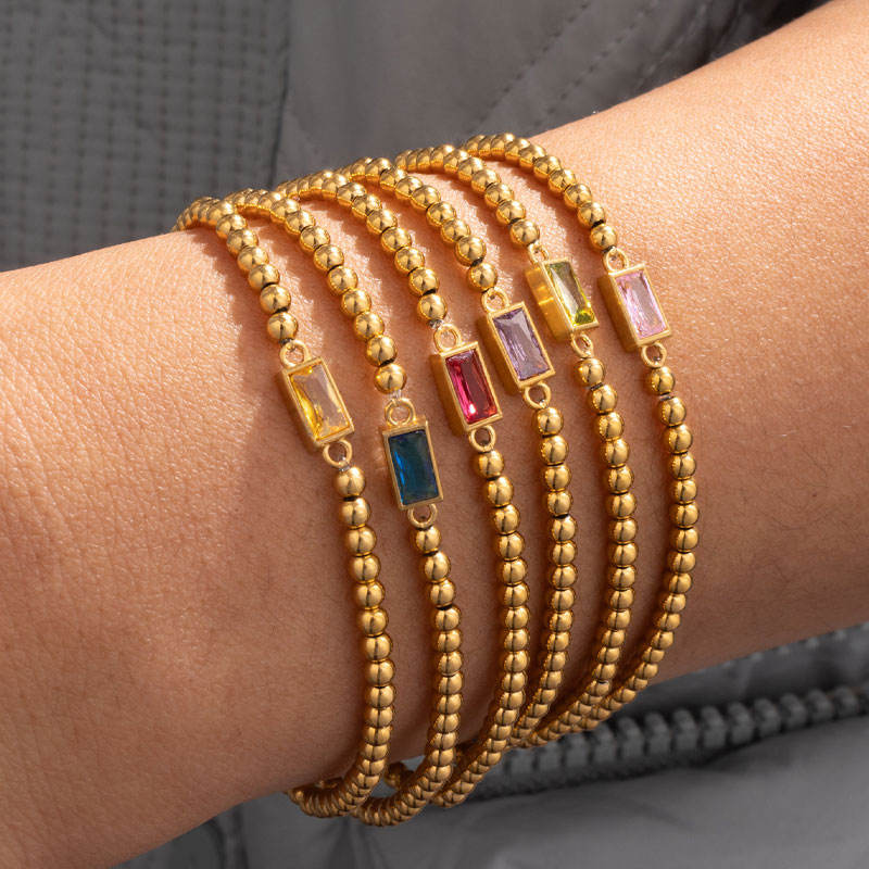 กำไลข้อมือลูกปัดเพทายชุบทอง 14k 18k สแตนเลส 316L แบบกำหนดเอง กำไลหินหลากสีแบบยืดได้สำหรับผู้หญิง