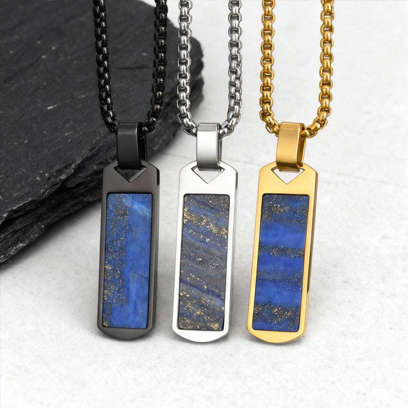 สร้อยคอจี้แฟชั่นสแตนเลสสตีล 316L แบบกำหนดเอง เครื่องประดับชั้นดี ลาพิส ลาซูลีและอาเกตแท้ รูปทรงแท่งยาว สร้อยคอผู้ชาย