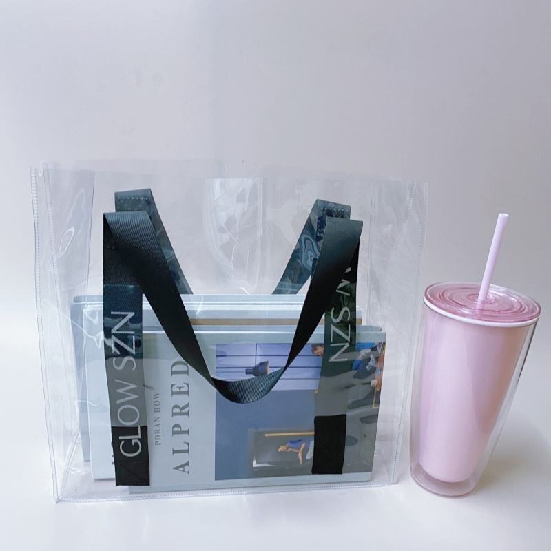 กระเป๋าสะพายไหล่ PVC 34*30*10ซม. กันน้ำมีหูหิ้วโปร่งใสกระเป๋าช็อปปิ้งลายพิมพ์โลโก้ออกแบบได้ตามต้องการ