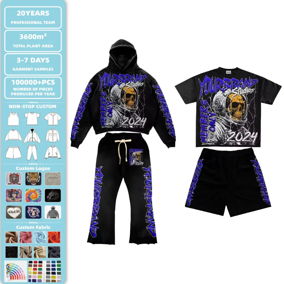 ชุดเซ็ตเสื้อฮู้ดดี้และกางเกงขายาวผ้าหนา 350 GSM แบบฟอกสี พร้อมงานปักและประดับคริสตัล