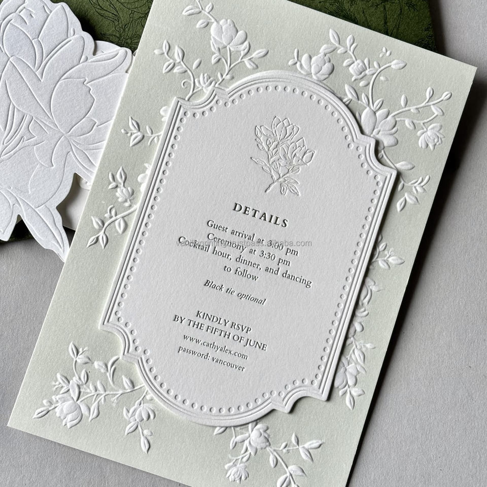 การ์ดเชิญงานพิเศษแบบนูนลาย 3 มิติ สีเขียวเซจ ทำจากกระดาษฝ้าย พร้อมซอง งานพิมพ์วานิลลา โลโก้สั่งทำได้