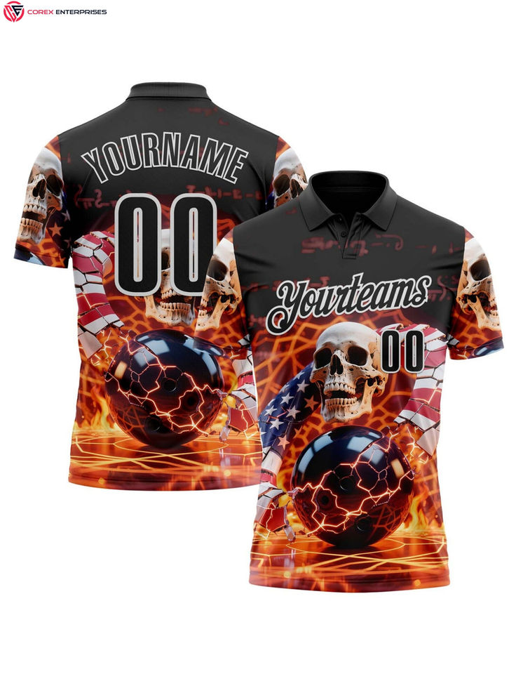 เสื้อโปโลลายหัวกะโหลกเปลวไฟขนาดพลัสไซส์สำหรับผู้ชายชุดโบวลิ่งสีดำทอง-แดง3D ตามสั่ง