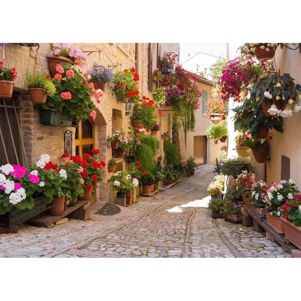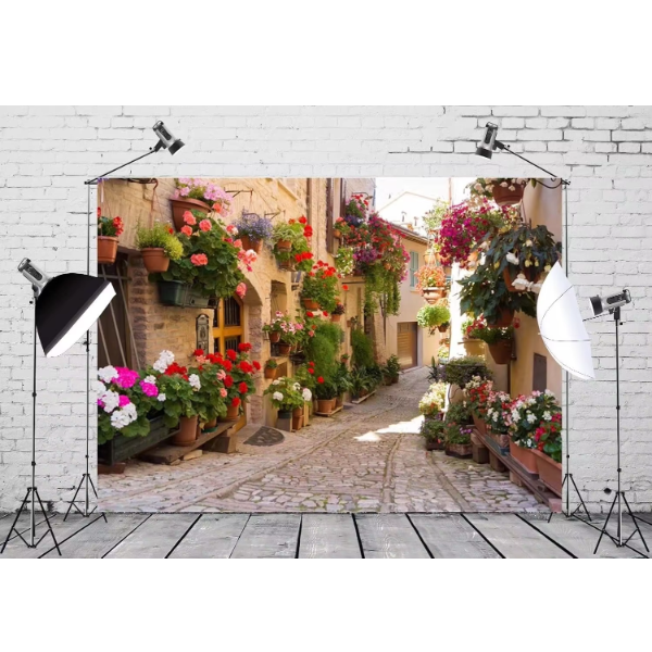 ฉากหลังถ่ายภาพ 3 มิติ แบบแบน ลายถนนอิตาลี วิวเมืองหมู่บ้านยุโรป อาคาร สำหรับตกแต่งงานอีเว้นท์ ผลิตตามสั่ง