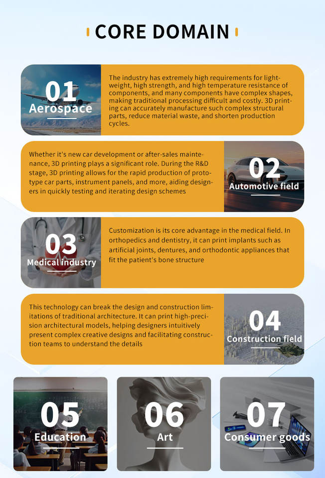 ชิ้นส่วนยานยนต์, การแพทย์และการดูแลสุขภาพ, ชิ้นส่วนอุตสาหกรรม, Awards and Corporate Gifts, Display Models and Scale Models, Prototyping and Functional Prototypes, Anime Figures and Collectibles, Equipment Enclosures and Housings, Custom Jewelry, Art and Sculptures, Home Decor, Aerospace and Aviationการประยุกต์ใช้ fields