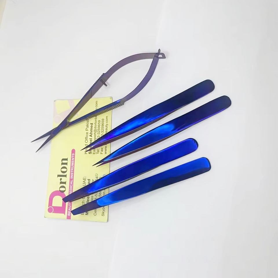 ชุดแหนบปลายแหลมสำหรับแต่งคิ้วกรรไกรตัดขนเหล็กพลาสม่าสีฟ้าแบบยั่งยืน4ชิ้นออกแบบได้ตามต้องการ