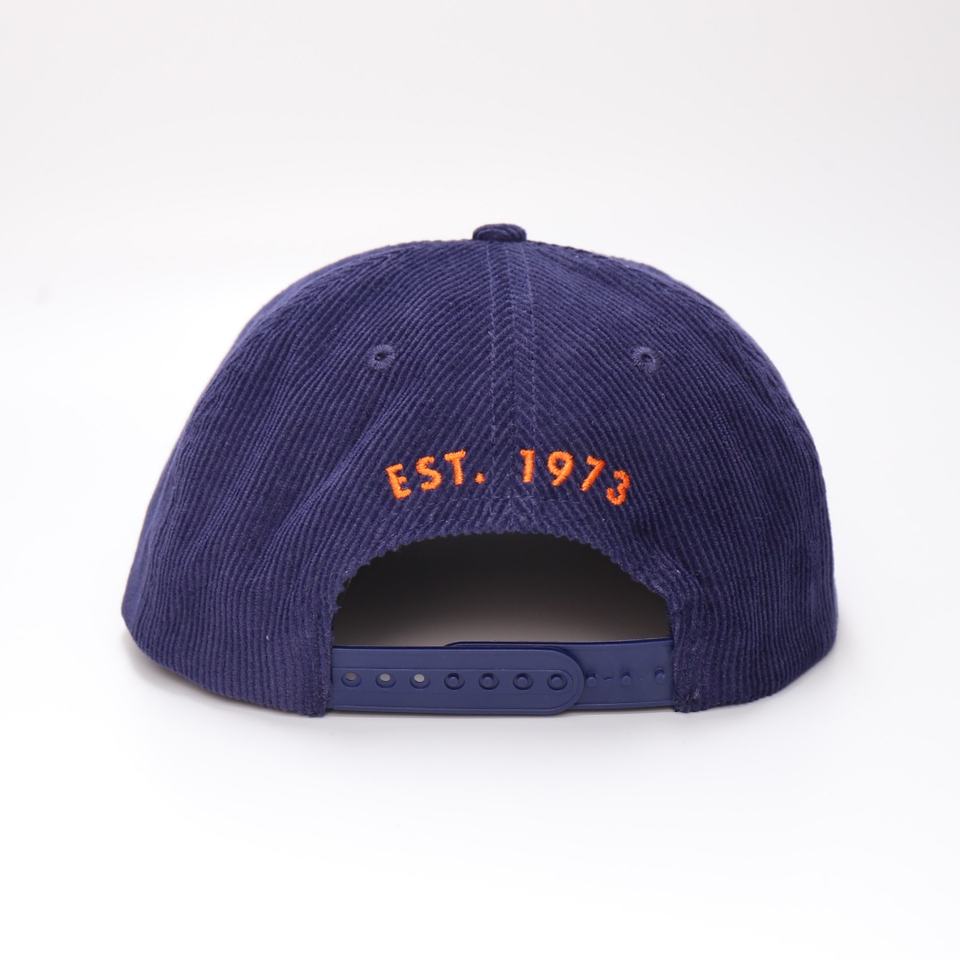 หมวกแก๊ปทรงแบน 5 แผง ปักโลโก้แบบเรียบ ผ้าคอร์ดูรอย ติดกระดุมแป๊ก