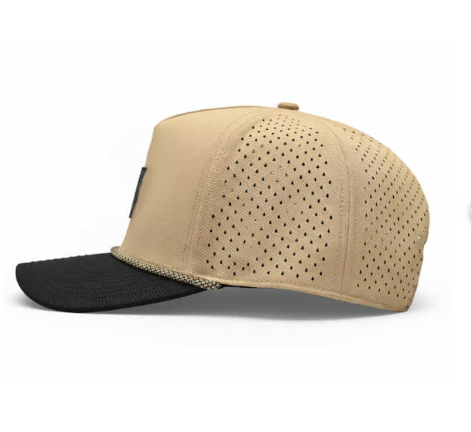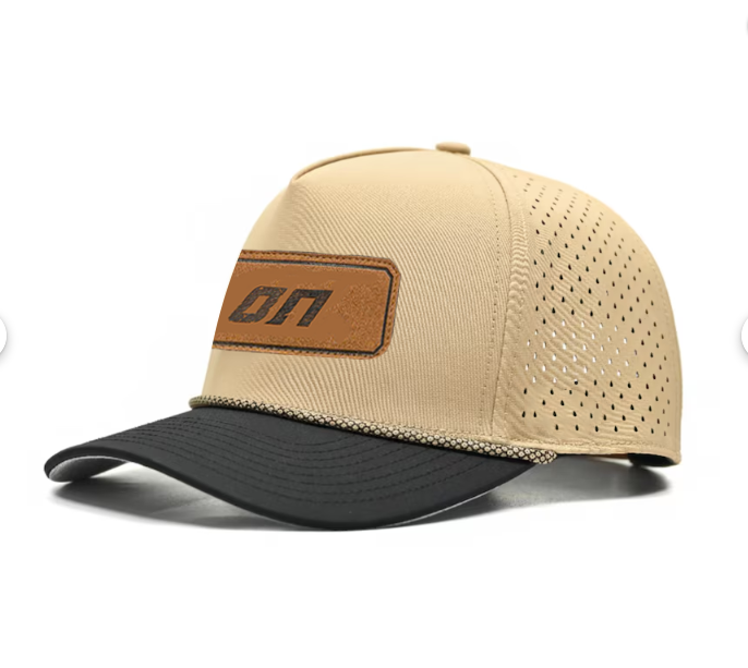 หมวกกอล์ฟกีฬาโพลีเอสเตอร์กันน้ำแบบกำหนดเอง 5 แผง พร้อมโลโก้ปะหนัง ดีไซน์เจาะรูด้วยเลเซอร์ หมวกเบสบอลแบบมีรูระบายอากาศพร้อมเชือก