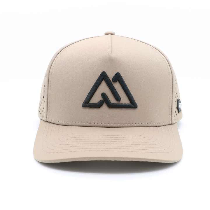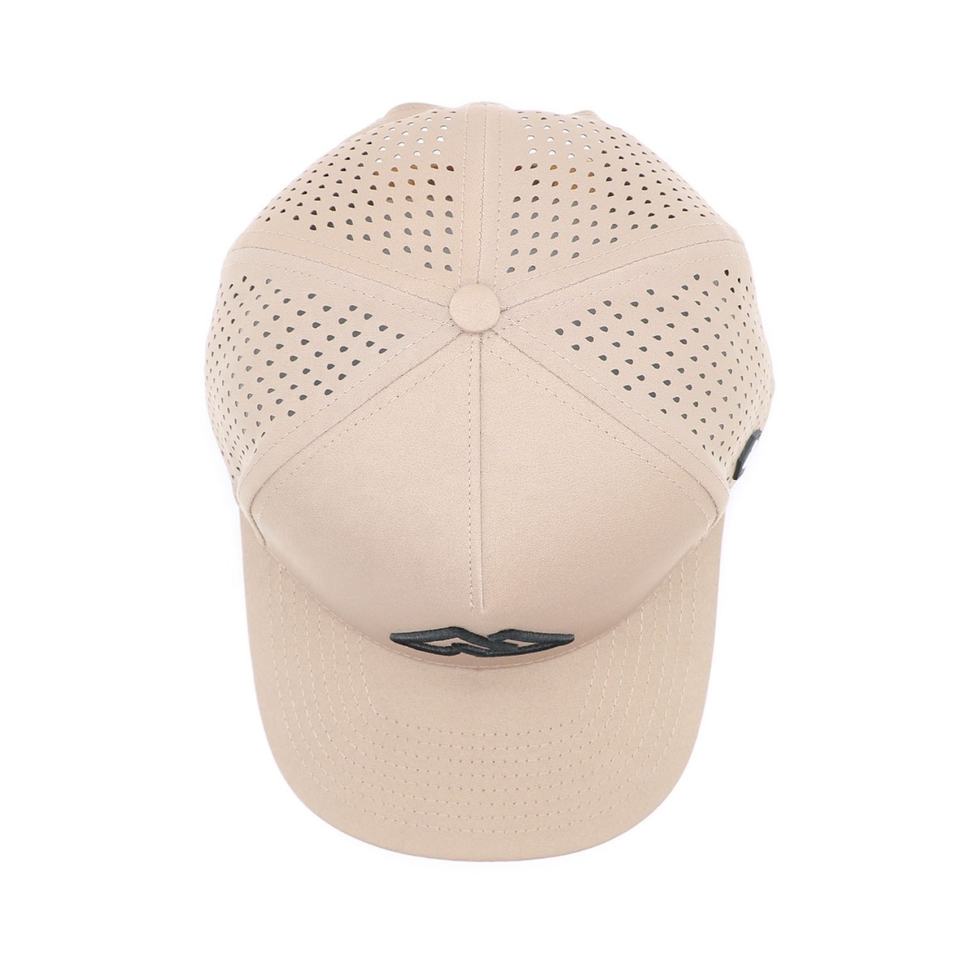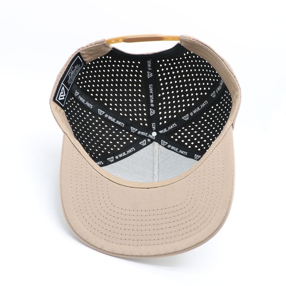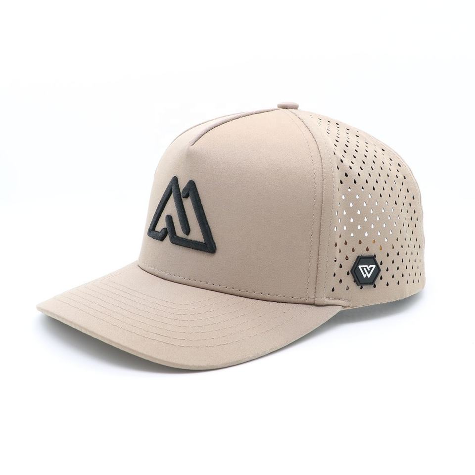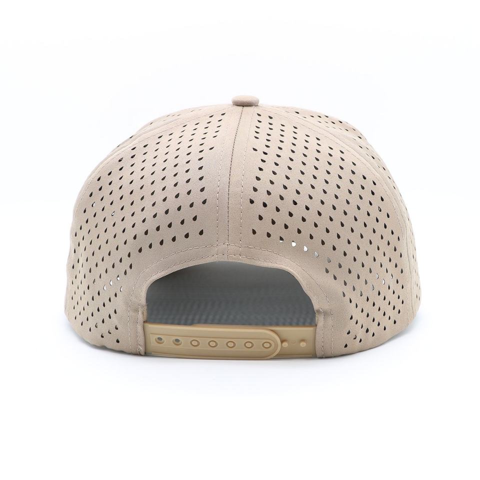 หมวกเบสบอลกอล์ฟสีกากีทรงโค้ง ปักโลโก้ 3 มิติ แบบกำหนดเอง 5 ชิ้นส่วน ทำจากผ้ากำมะหยี่โพลีเอสเตอร์ พร้อมรูเจาะแบบเลเซอร์