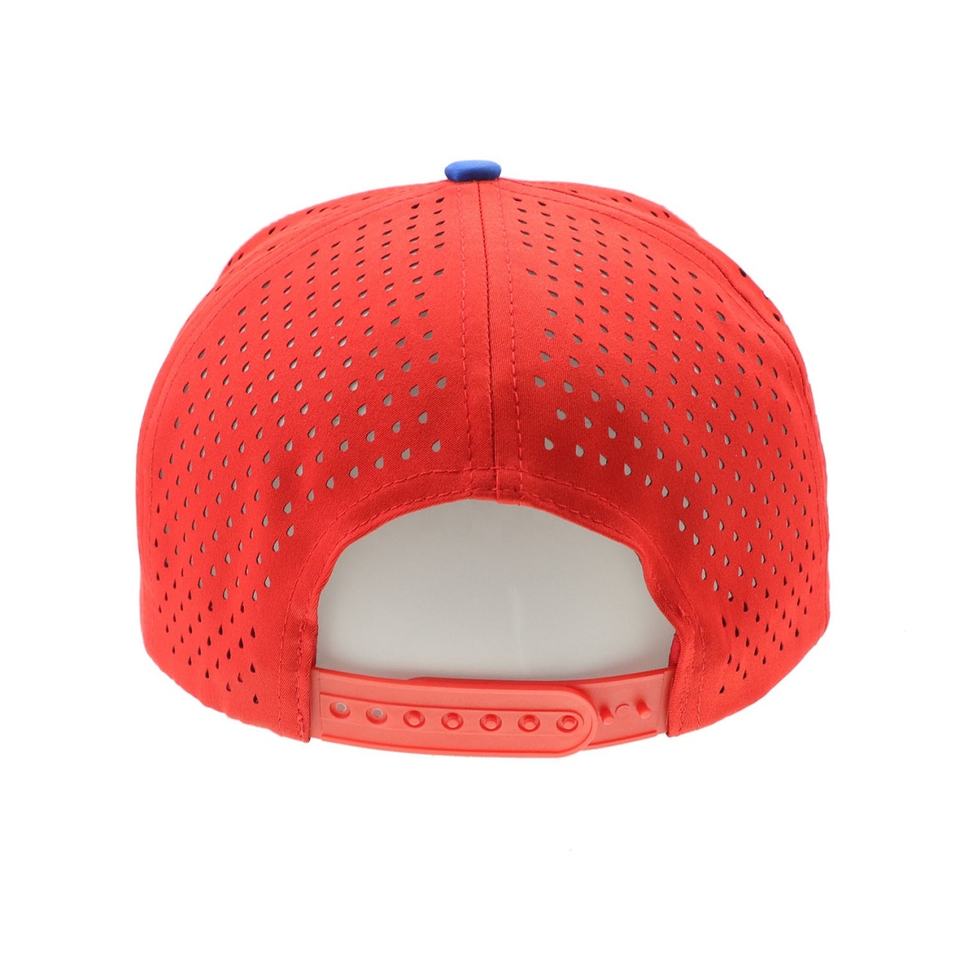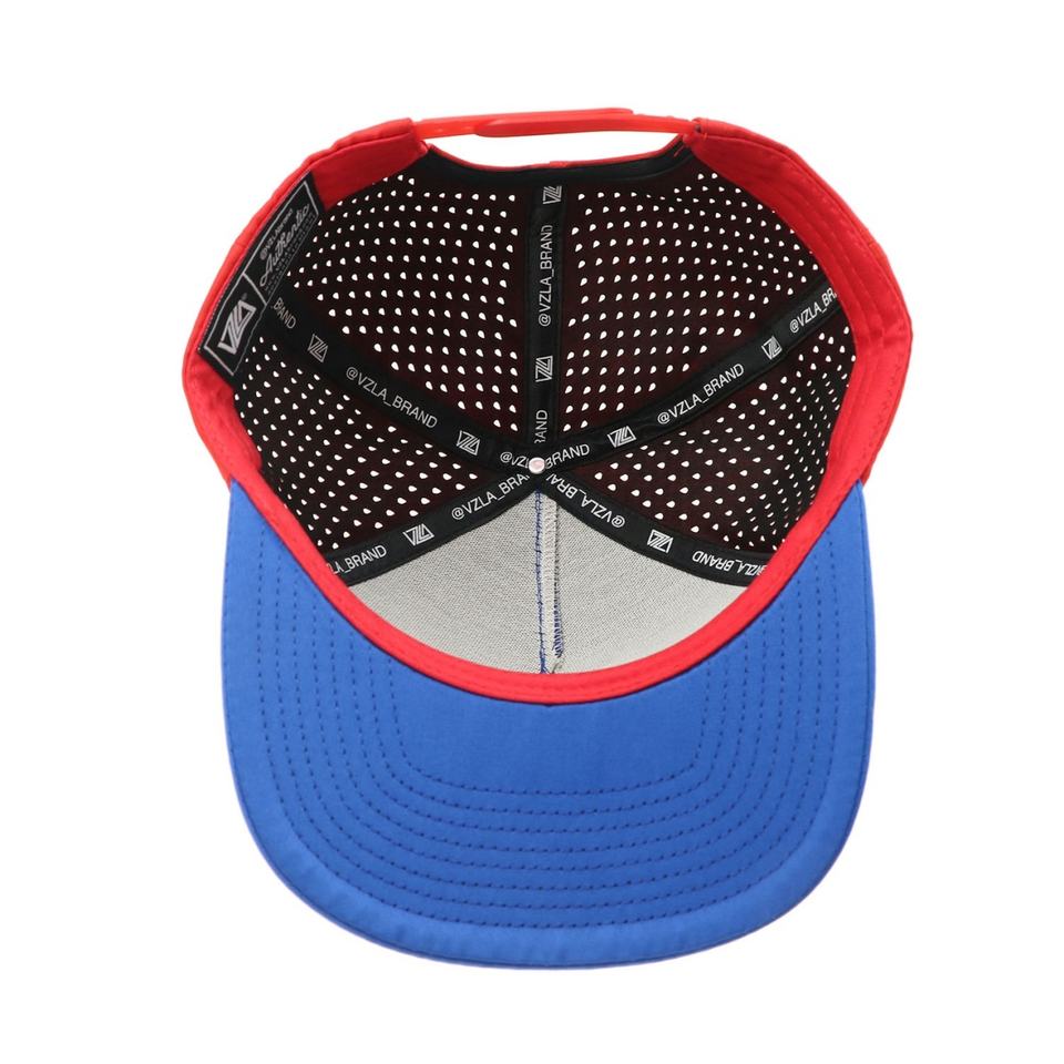 หมวกเบสบอลแบบมีรูเจาะ 2 สี แดง/น้ำเงินกรมท่า พร้อมป้ายยาง 5 ชิ้น ปักโลโก้ 3 มิติ แบบเลเซอร์คัท