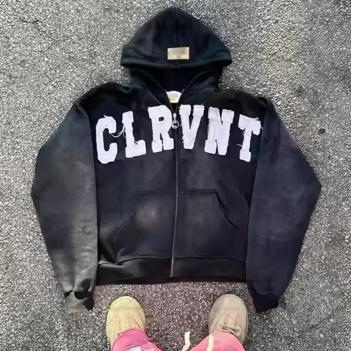 เสื้อมีฮู้ดปักลายมีซิปผ้าเกล็ดปลาทำจากผ้าฝ้าย GSM French Terry 500ออกแบบได้ตามที่ต้องการ
