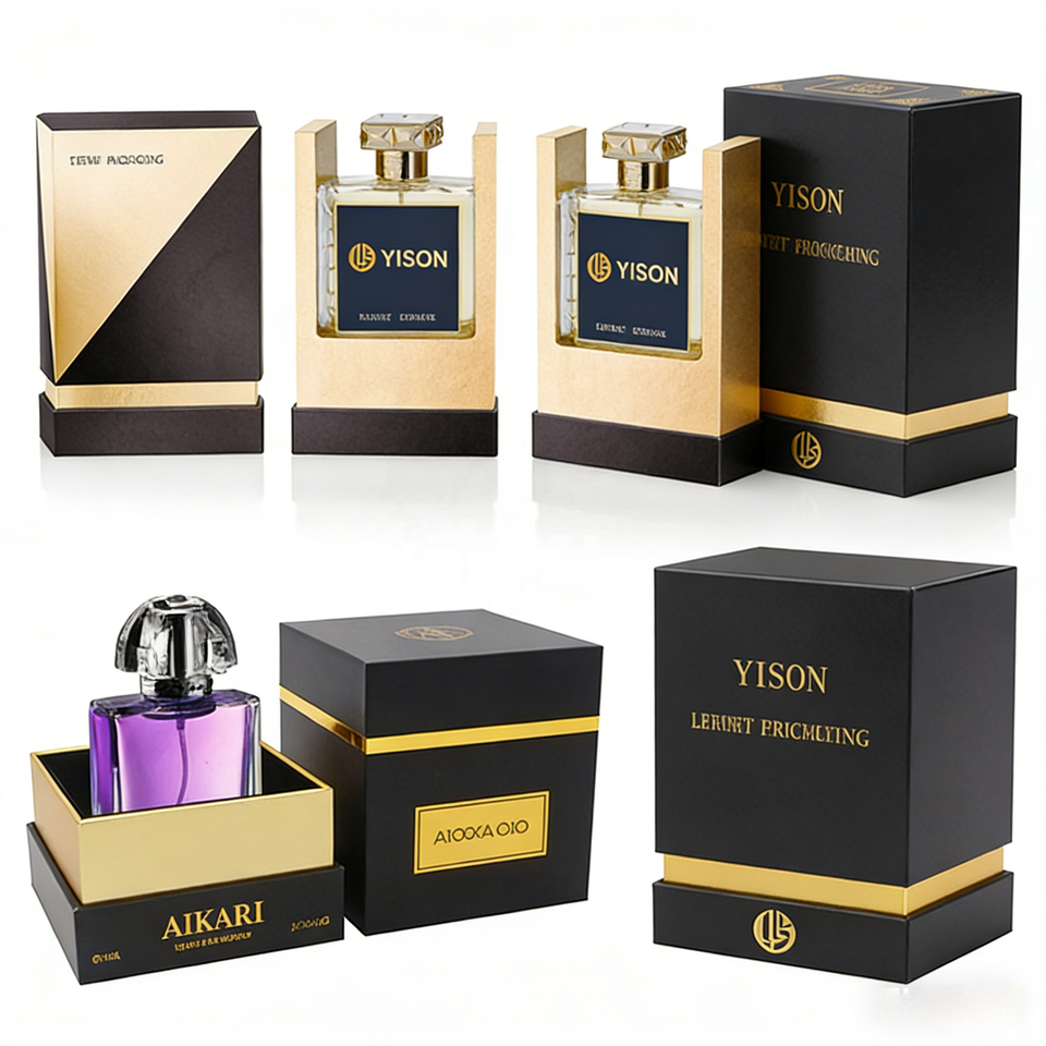 กล่องของขวัญน้ำหอมแบบกำหนดเองขนาด 50 มล. กล่องกระดาษแข็งหรูหราเคลือบด้าน ปั๊มนูนฟอยล์ทอง รีไซเคิลได้ ออกแบบฟรี