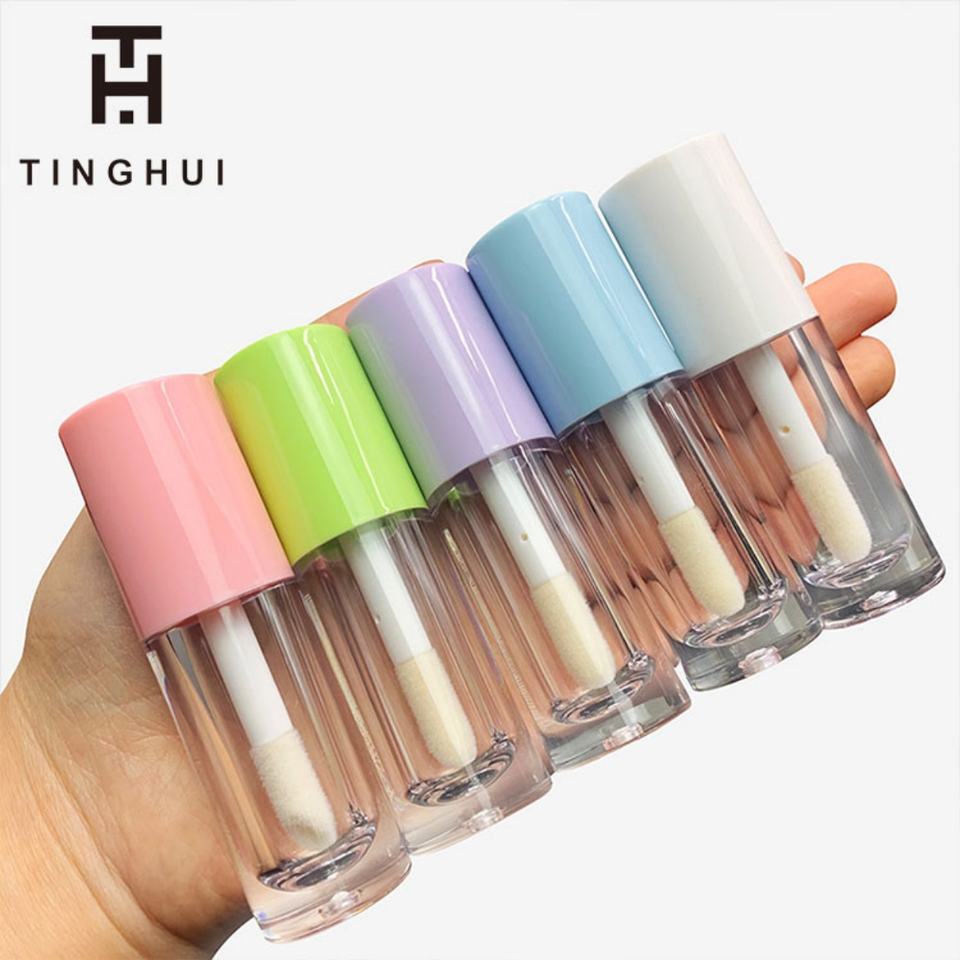 ขวดลิปกลอสสีสันสดใสขนาด 6 มล. แบบกำหนดเอง พร้อมแปรงทาหนาและหัวแปรงขนาดใหญ่ บรรจุภัณฑ์เครื่องสำอางแบบหลอดลิปกลอสเปล่าพร้อมแปรงทาหนาและหัวแปรงขนาดใหญ่