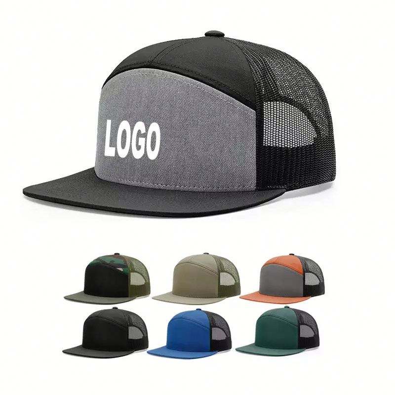 หมวกแก๊ป 7 แผงแบบกำหนดเอง ดีไซน์ตาข่ายปีกแบน พร้อมปักโลโก้ หมวก Trucker พิมพ์ลายดิจิตอล หมวก Snapback ลายพราง