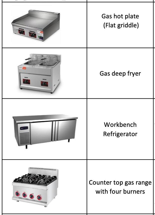 เตา, เครื่องทอด, เตาย่างแบบเรียบ, กระทะปิ้ง, ไมโครเวฟ, เตาอบ, พานินี่เพรส, เตาอบพิซซ่า, เตรียมพื้นที่อุปกรณ์ทำอาหาร