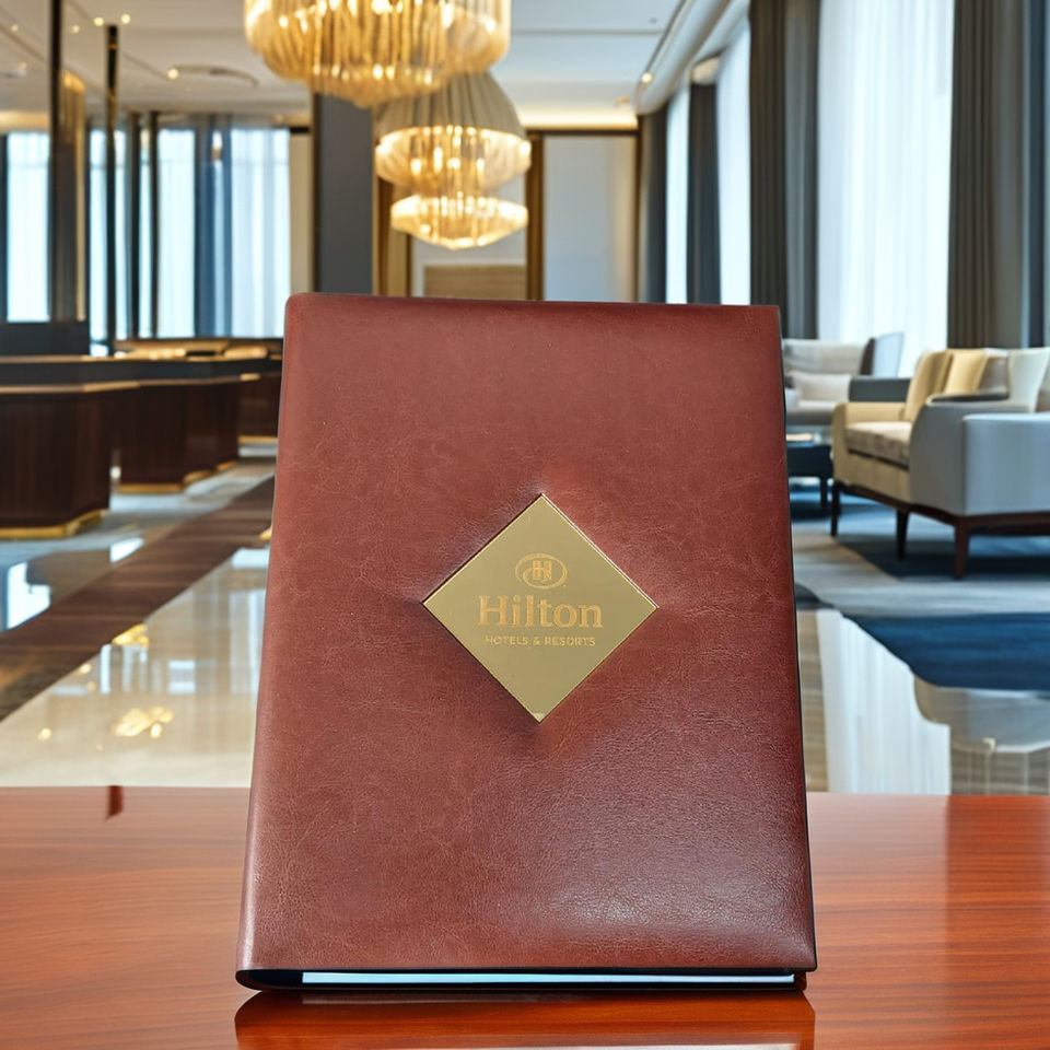 แฟ้มเมนูหนัง PU ขนาด A4 สำหรับโรงแรม ร้านอาหาร พร้อมคลิปหนีบ โลโก้อะคริลิค ดีไซน์ทันสมัย สีตามสั่ง ได้รับการรับรองมาตรฐาน ISO9001 ขั้นต่ำในการสั่งซื้อ 25 ชิ้น