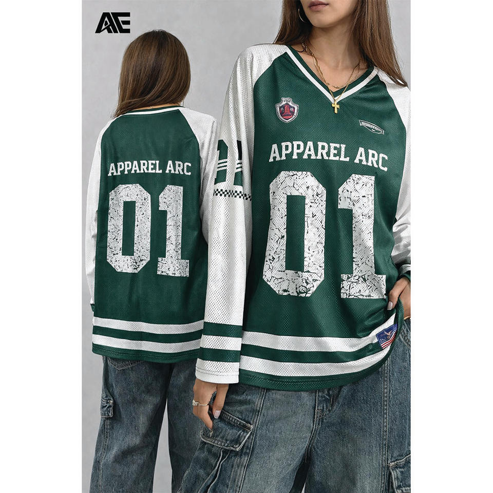 เสื้อผ้าสั่งทำ ARC Oversized Mesh Jersey แขนยาว คอวี พิมพ์ลายตัวเลข สตรีทแวร์ ท็อปส์ รับผลิตแบบ OEM ODM ขายส่ง
