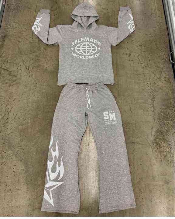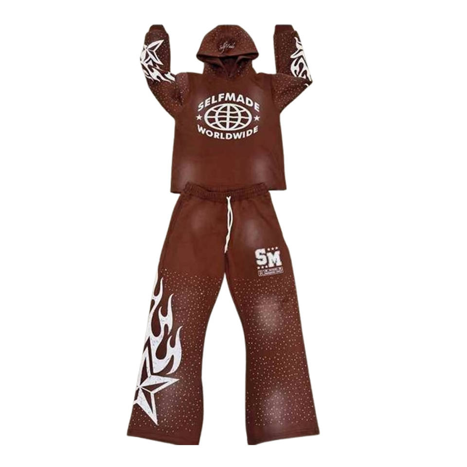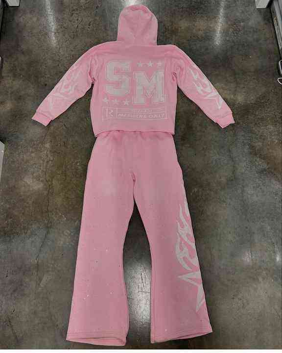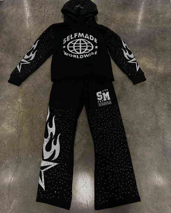 เสื้อฮู้ดกางเกงขายาวเปิดขากว้างทรงหลวมมีสกรีนลายพลอยเทียมออกแบบได้ตามต้องการ