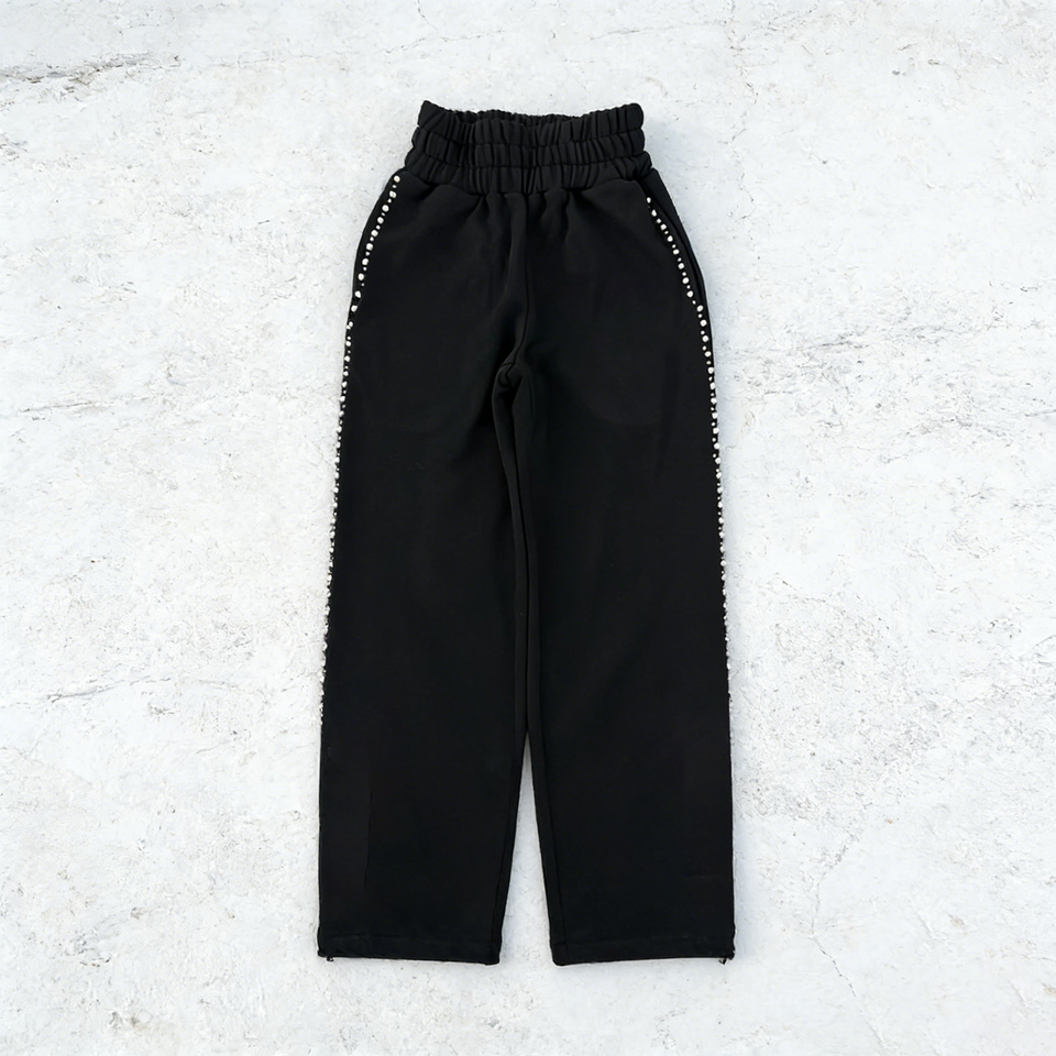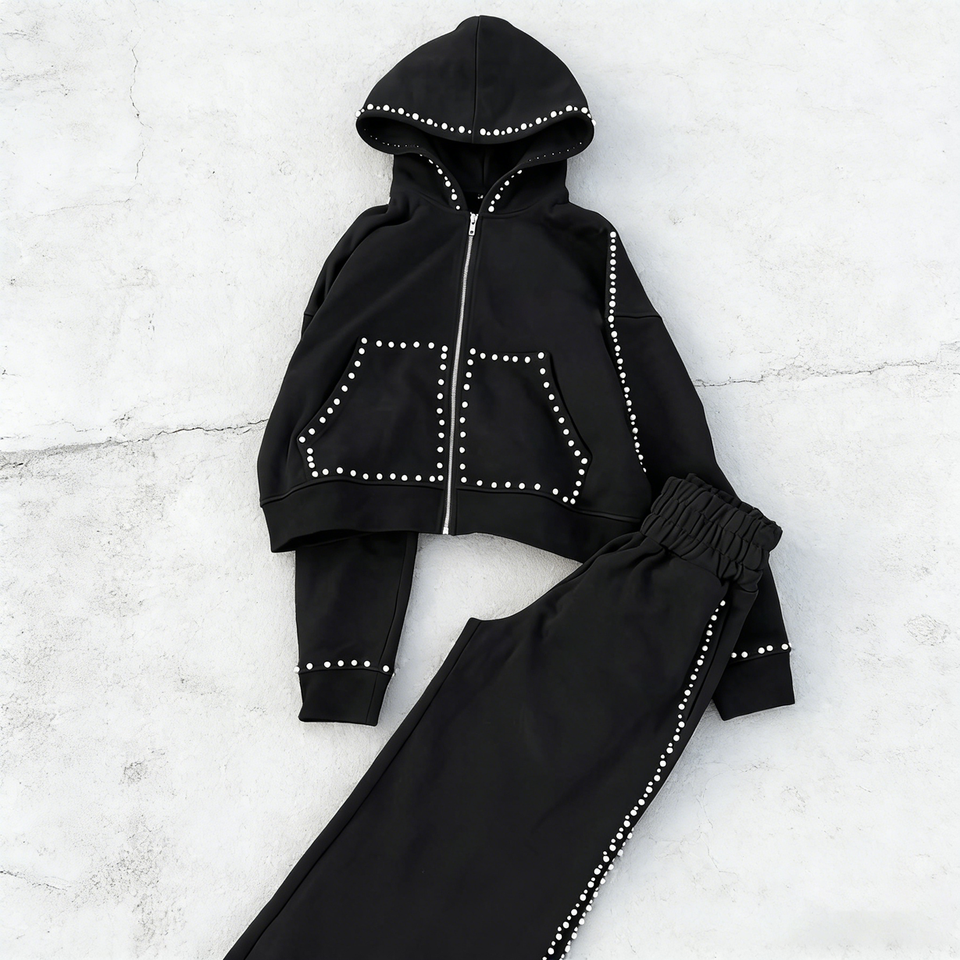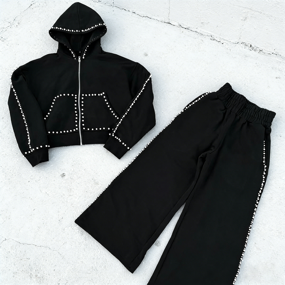ชุดวอร์มพิมพ์ลายแบบมีฮู้ดและกางเกงขายาวทรงบานเอวสูง แต่งด้วยคริสตัลและไข่มุกสไตล์วินเทจด้วยเทคนิคการฟอกสีแบบพิเศษ