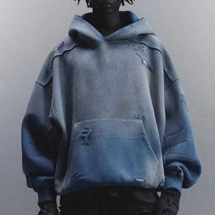 เสื้อฮู้ดดี้โอเวอร์ไซส์ผ้าฝ้าย 100% หนานุ่ม ซิปหน้า ปักลายแบบแอซิดวอช ตกแต่งด้วยดีไซน์ดิสเทรสและไหล่ตก