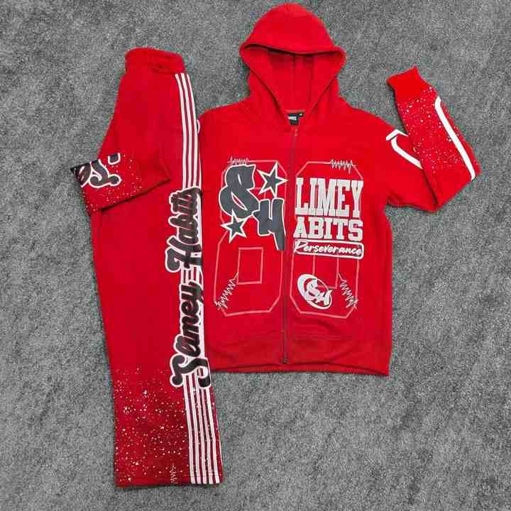 ชุดฮู้ดดี้ย้อมสีแบบแอซิดวอชสำหรับผู้ชาย พร้อมกางเกงวอร์มขาบานปักลาย สไตล์วินเทจสตรีทแวร์ ผ้าหนา ซิปฮู้ดดี้ ชุดวอร์ม