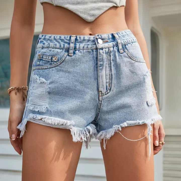 กางเกงยีนส์ขาสั้นสีฟ้าอ่อนฟอกกรดแบบขาดๆ สำหรับผู้หญิง สไตล์ลำลอง เอวสูง ขอบดิบ เหมาะสำหรับฤดูร้อน