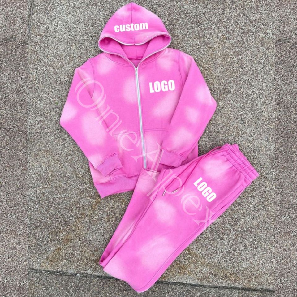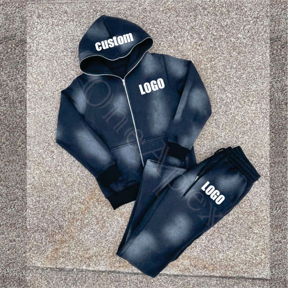 ชุดวอร์มผ้าฝ้ายแบบรูดซิปสำหรับผู้ชายชุดวอร์มผ้าคอตตอนสีจางมีฮู้ดและกางเกงขายาวออกแบบได้ตามต้องการ