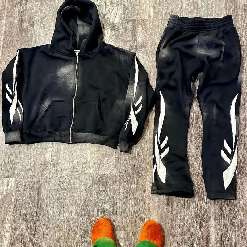 ชุดวอร์มลายพรางสปริงแบบย้อมสีพิเศษ ผ้าฝ้ายฟลีซหนา ซิปติดลายปัก แอพพลิเคชั่น แพทช์ปัก ทรงขาบาน เสื้อฮู้ดดี้ผู้ชายแบบเต็มตัว