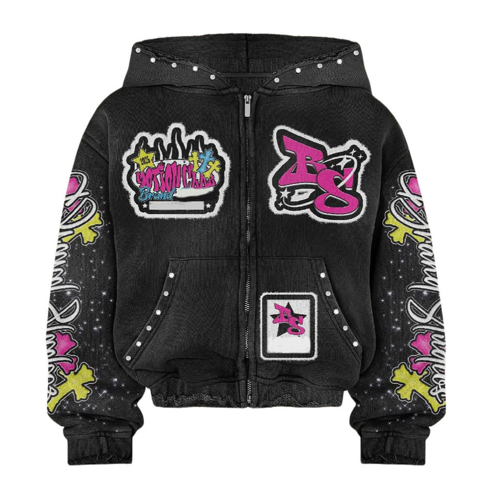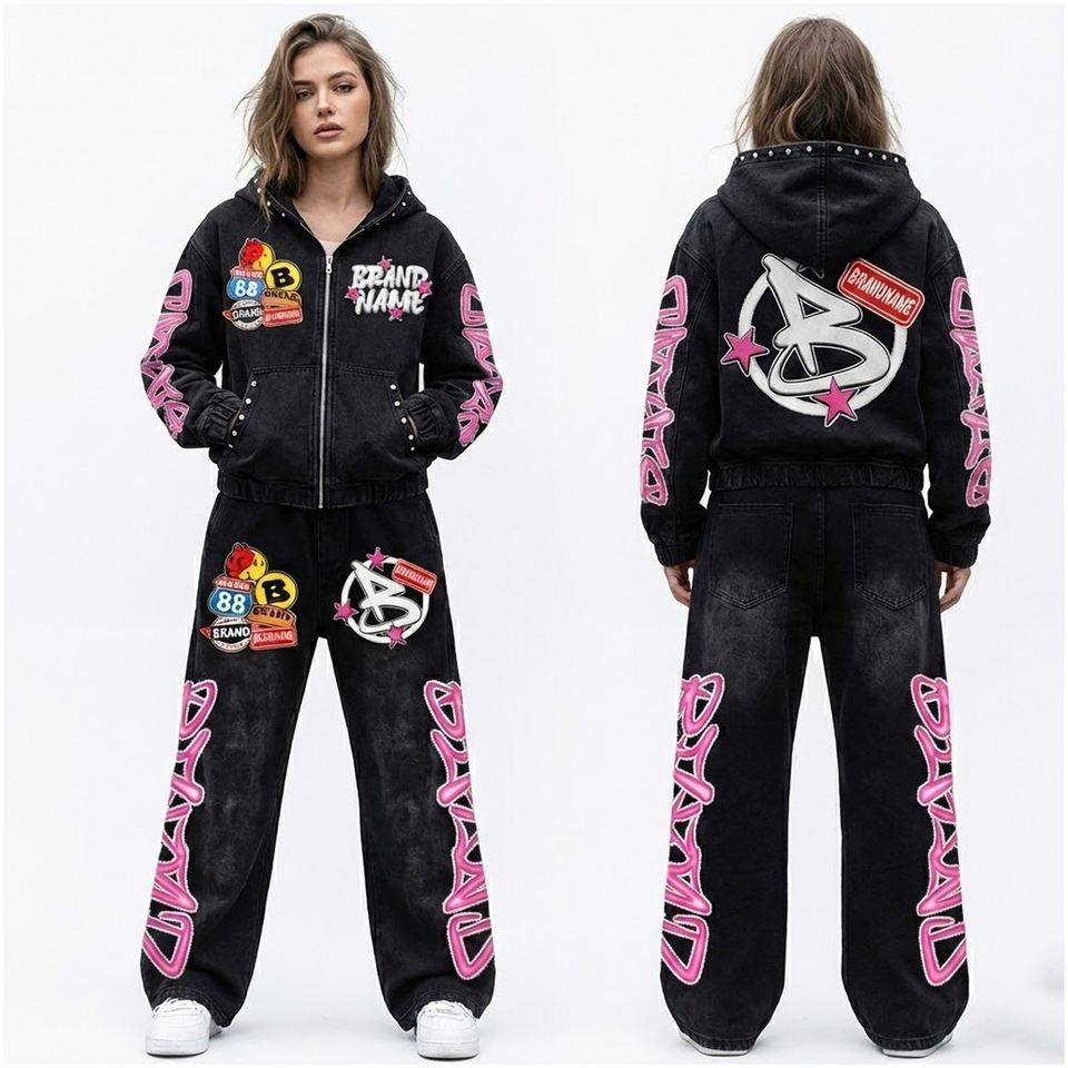 ชุดเซ็ตแทรคสูทแบบยูนิเซ็กซ์ ลวดลายกราฟิกหลายจุด ซิปเต็มตัว เสื้อฮู้ดดี้ กางเกงขาบาน ผ้าหนานุ่ม สไตล์วินเทจ สตรีทแวร์