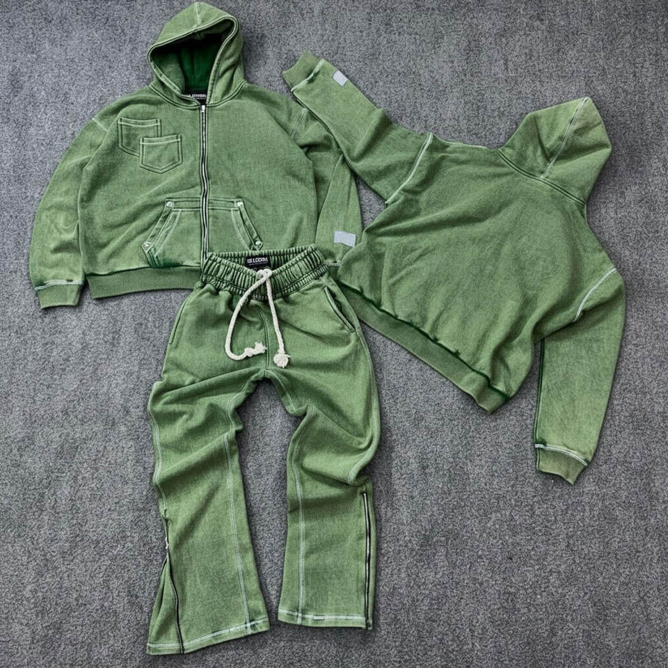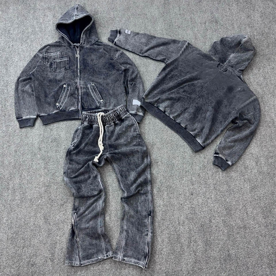 ชุดเซ็ตสตรีทแวร์ผู้ชาย เสื้อฮู้ดดี้และกางเกงขายาวสไตล์วินเทจ ลวดลายตัวอักษรแบบย้อมสีเอซิด แต่งผ้าปะติดแบบดิสเทรส