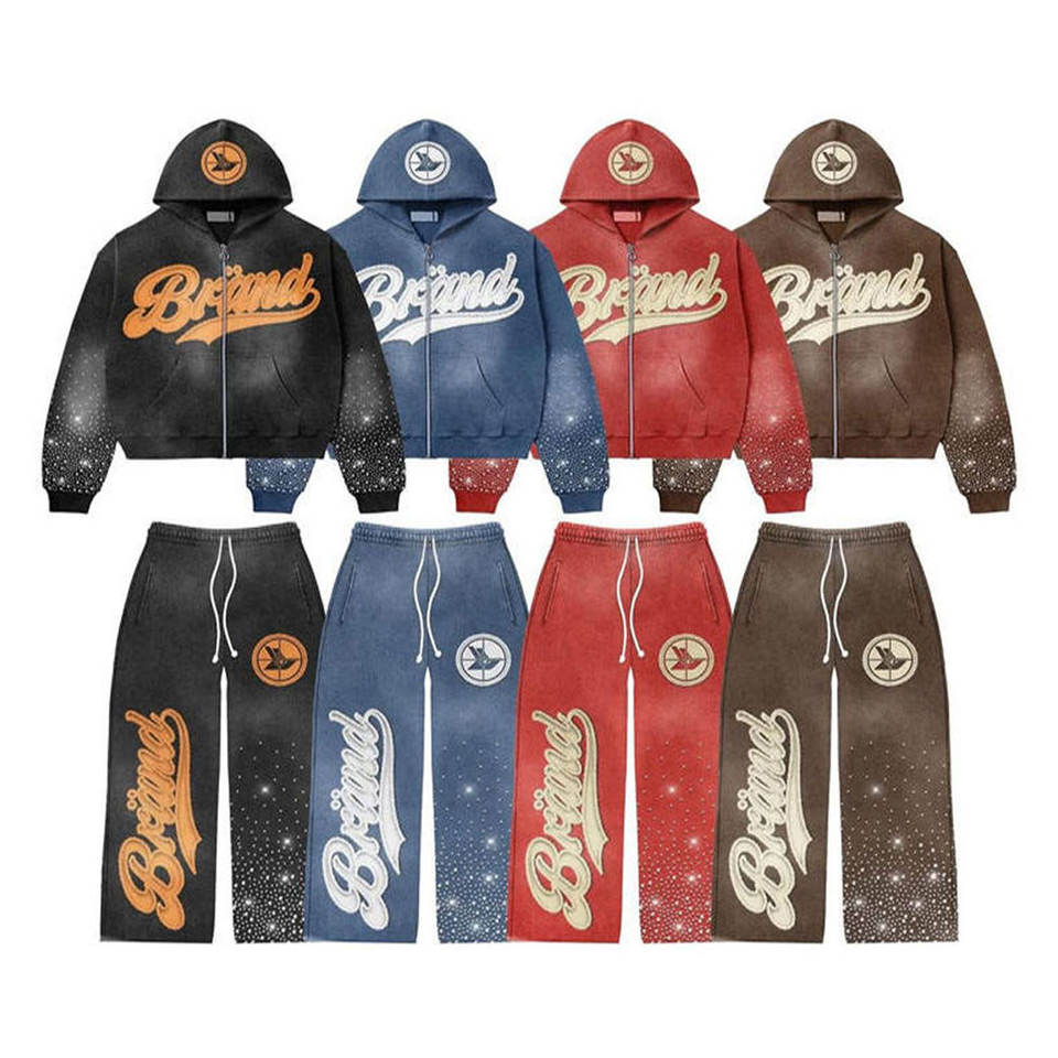 ชุดวอร์มวินเทจประดับพลอยเทียมพร้อมแผ่นปะติดลายปักกางเกงวอร์มทรงบานผ้าบ็อกซี่และชุดเสื้อสเวตเตอร์แบบกำหนดเอง