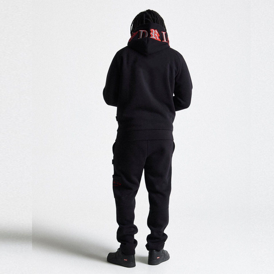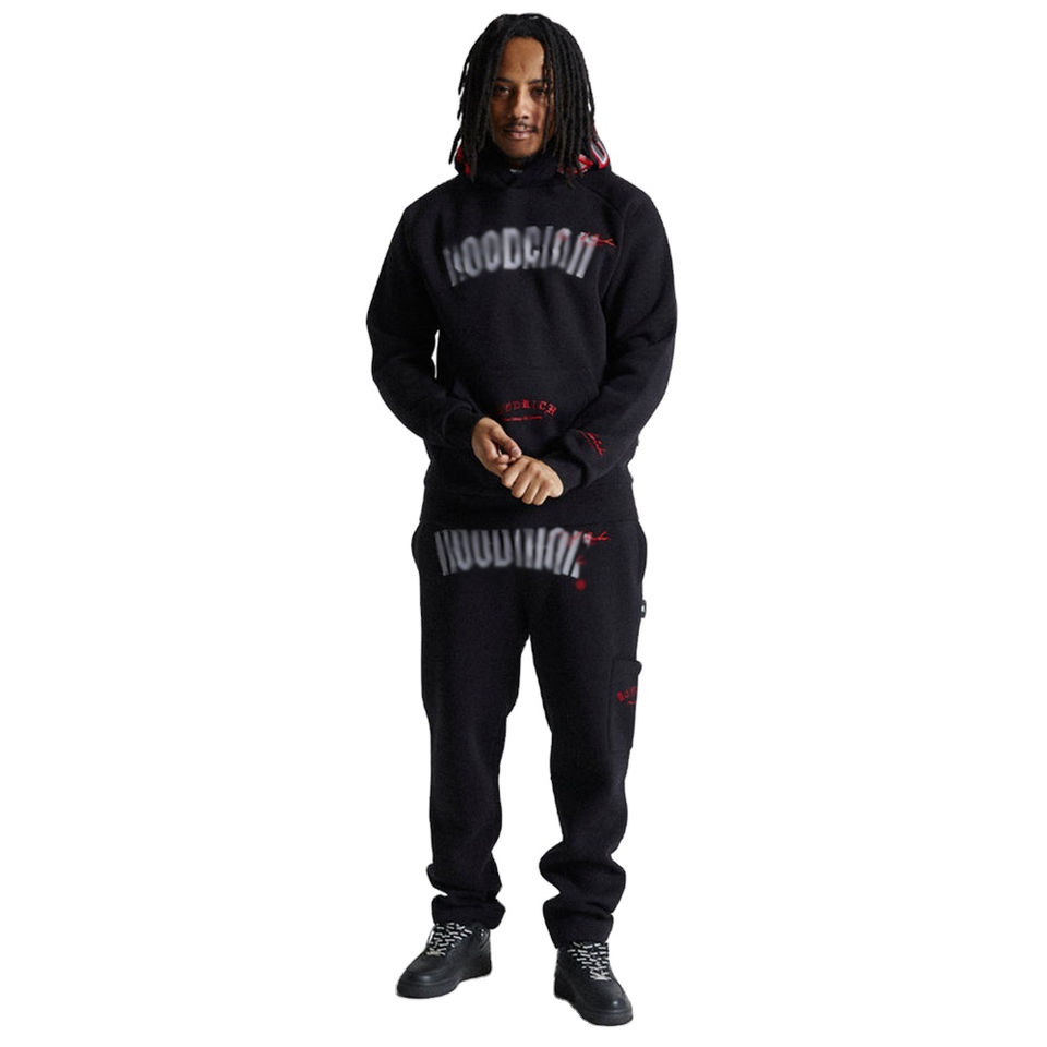 ชุดวอร์มผู้ชายแบบย้อมสีเอซิดสั่งทำพิเศษ พร้อมงานปักแบบดิสเทรส ชุดฮู้ดดี้ทรงบานปลายดิบ และกางเกงวอร์มสไตล์สตรีทแวร์สำหรับผู้ชาย