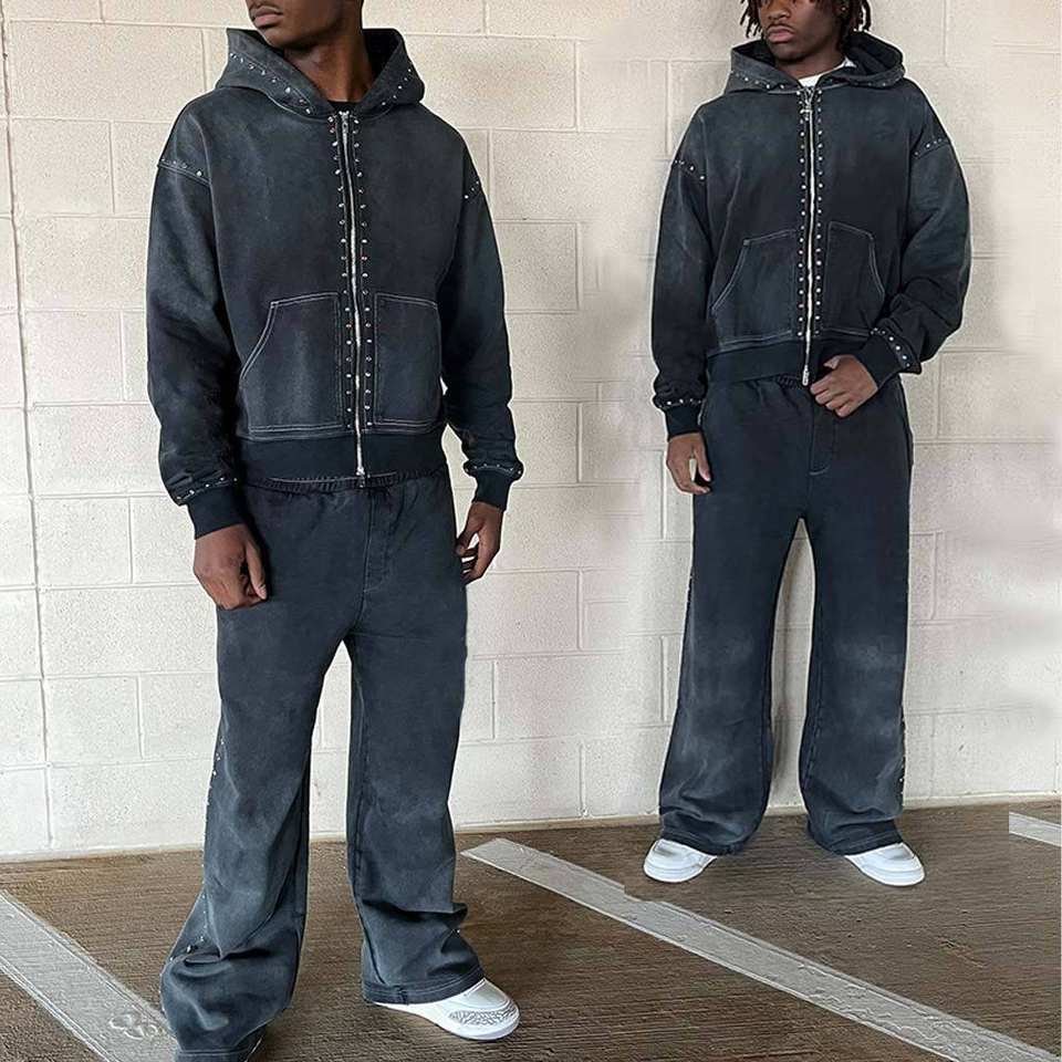 เสื้อฮู้ดดี้ผู้ชายสไตล์วินเทจ ย้อมสีแบบแอซิดวอช ผ้าฝ้ายเฟรนช์เทอร์รี่ ตัดเย็บทรงครอป พิมพ์ลาย DTG แบบดิสเทรส ซิปประดับคริสตัล
