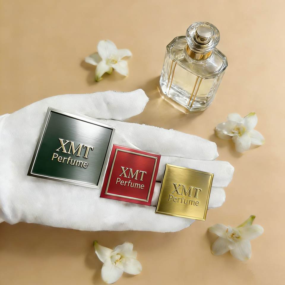 โลโก้ทองคำนูน 3 มิติ แบบกำหนดเองบนแผ่นโลหะอะลูมิเนียม สำหรับฉลากบรรจุภัณฑ์ขวดน้ำหอมและไวน์