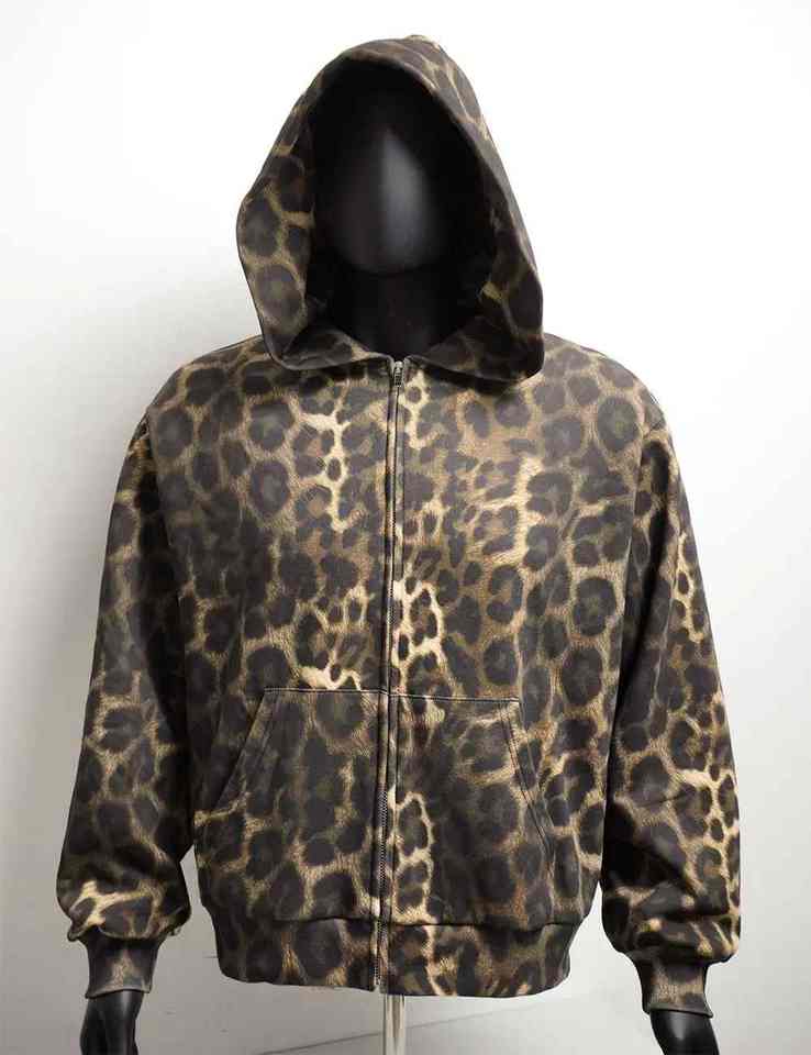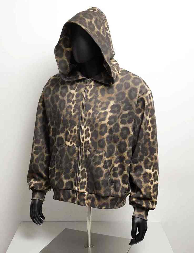 เสื้อฮู้ดดี้ทรงบ็อกซี่แบบซิป ไม่มีเชือกผูก ผ้าวาฟเฟิลสองชั้น หนานุ่ม พิมพ์ลายเสือชีตาห์ดิจิทัลทั่วตัว สำหรับผู้ชาย