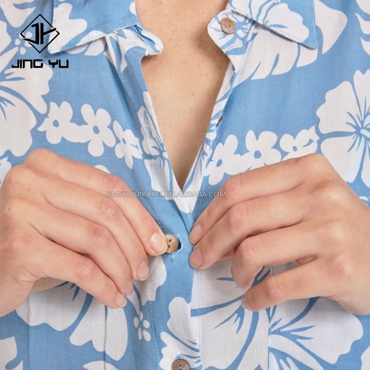เสื้อเชิ้ตเรยอนพิมพ์ลายทั้งตัวแบบกระดุมผ่าหน้าสำหรับผู้หญิง สไตล์เสื้อฮาวาย