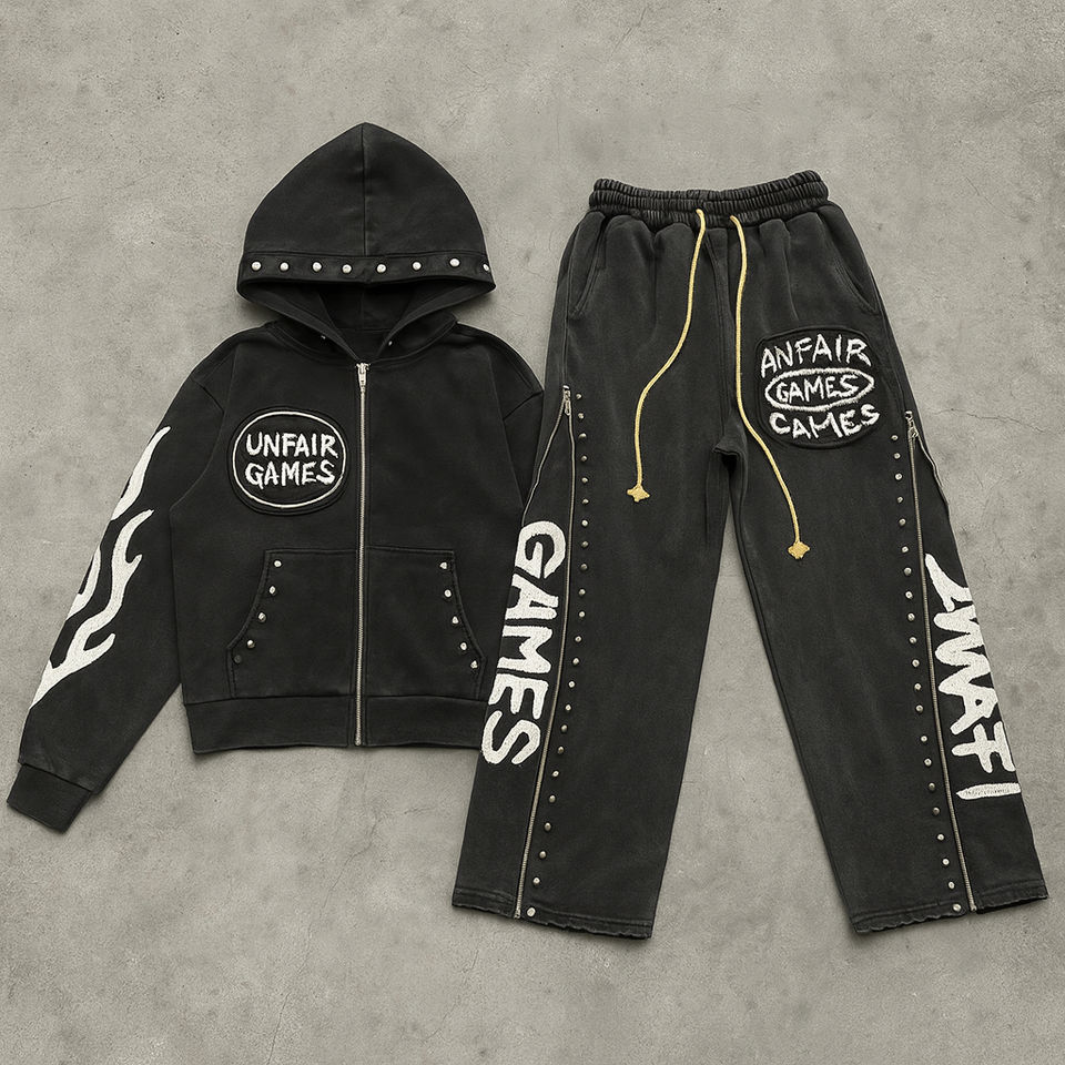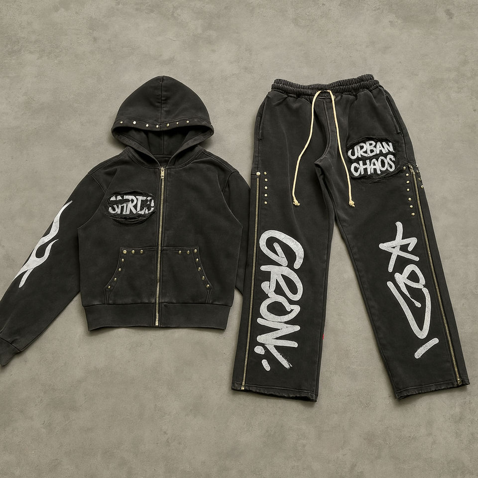 ชุดวอร์มพิมพ์ลายทั้งตัวแบบสตรีทแวร์ 400 กรัม ชุดเซ็ต 2 ชิ้น เสื้อฮู้ดดี้ผ้าฝ้ายเทคฟลีซดีไซน์เนอร์ สำหรับผู้ชาย
