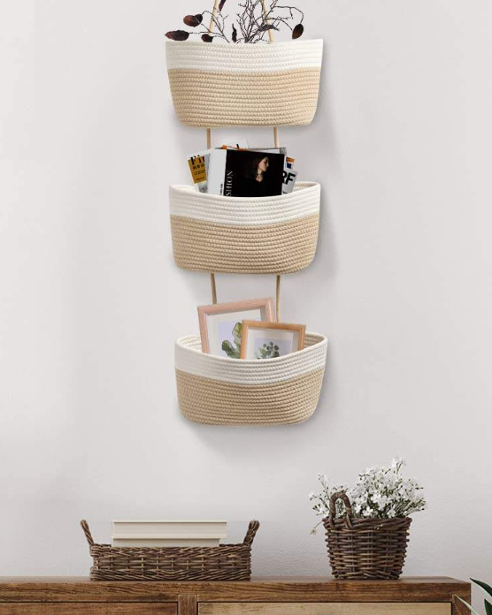 ตะกร้าแขวนผนังทำจากผ้าฝ้ายปอกระเจาพร้อมที่จับของตกแต่งบ้านในร่มสีขาวและสีตามสั่งทุกขนาด