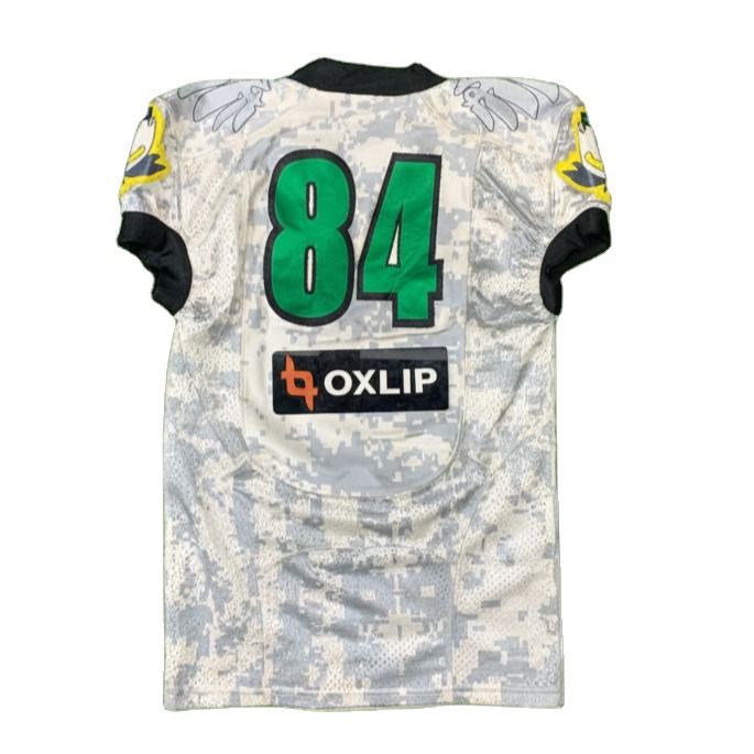 ชุดเสื้อฟุตบอลอเมริกันแบบกำหนดเองพิมพ์ลายพรางดิจิตอลผ้าตาข่ายระบายอากาศสั้นป้องกันแบคทีเรีย100% โพลีเอสเตอร์