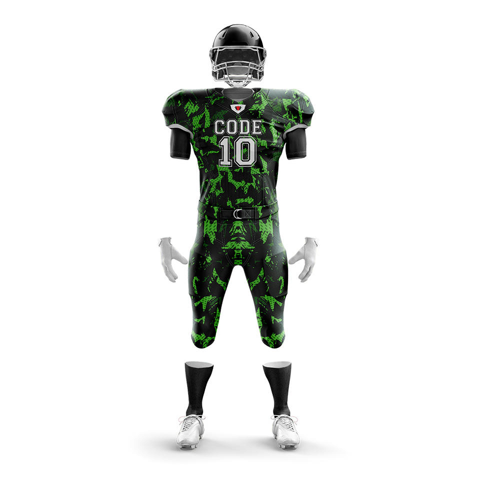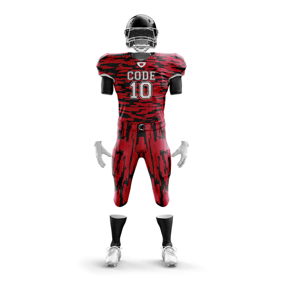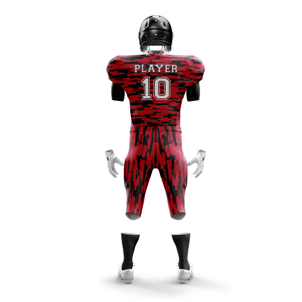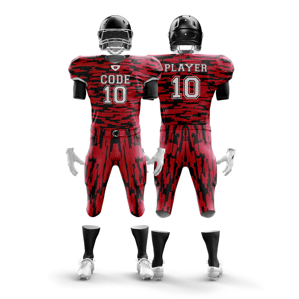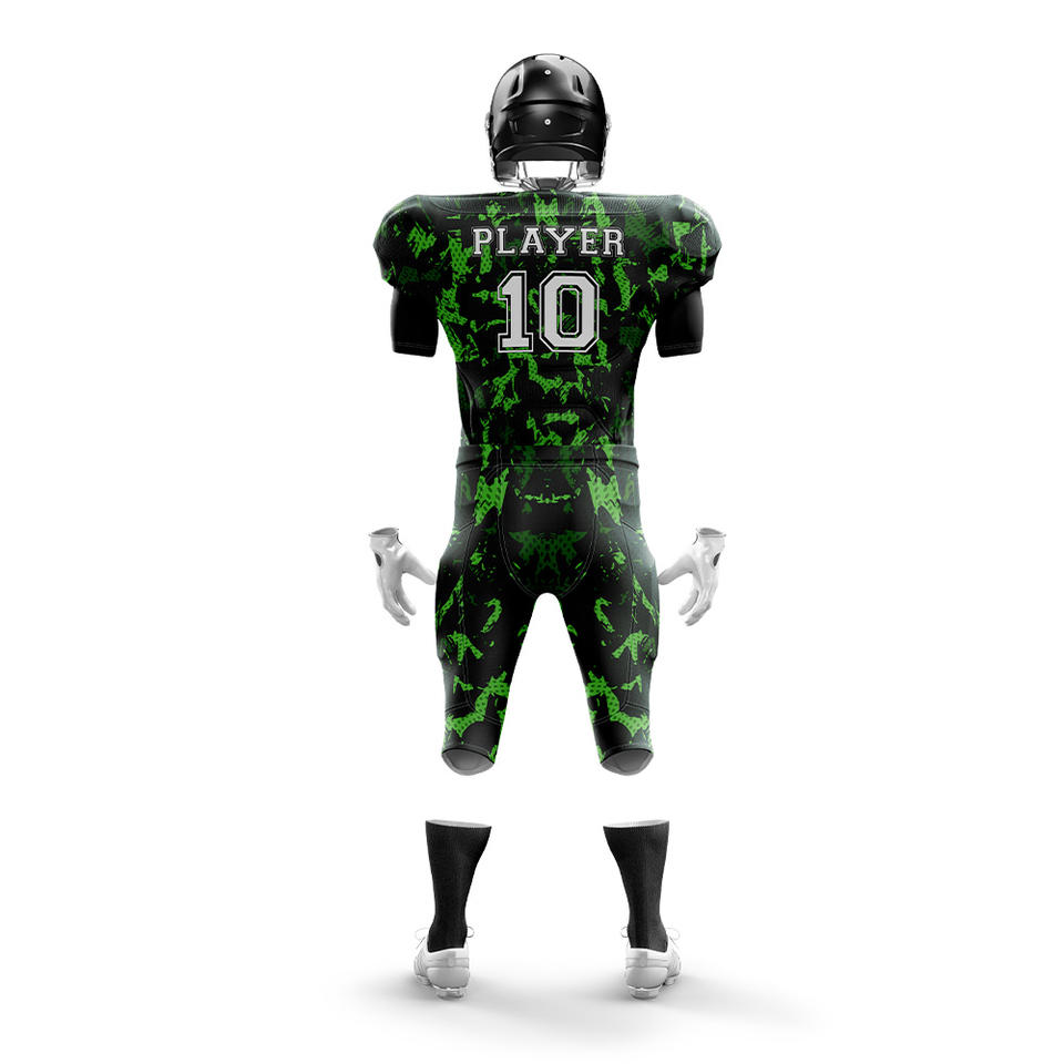 ชุดเสื้อและกางเกงอเมริกันฟุตบอลแบบสั่งทำพิเศษ พิมพ์ลายแบบซับลิเมชั่น สีและโลโก้ตามสั่ง ป้องกันแบคทีเรีย แห้งเร็ว ระบายอากาศได้ดี 100%