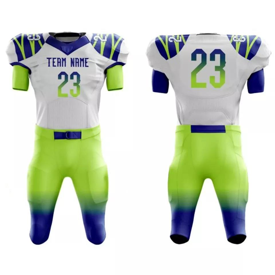 ชุดยูนิฟอร์มอเมริกันฟุตบอลแบบสั่งทำพิเศษ โพลีเอสเตอร์ 100% ระบายอากาศได้ดี ป้องกันแบคทีเรีย ป้องกันรังสียูวี กางเกงขาสั้นเอวยางยืด
