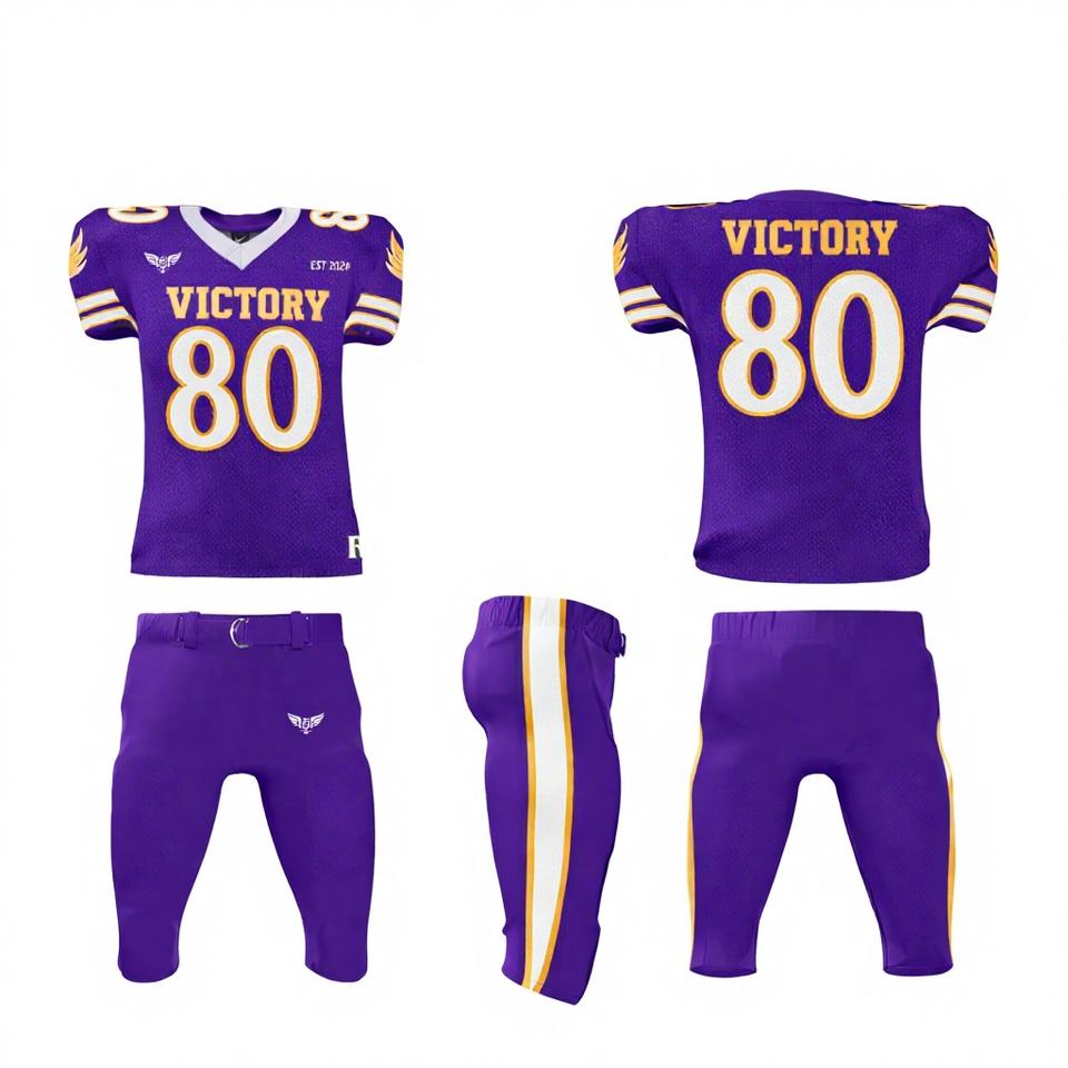 ชุดยูนิฟอร์มอเมริกันฟุตบอลสีม่วงทองแบบกำหนดเอง เสื้อและกางเกงแบบซับลิเมชั่น ระบายอากาศได้ดี ชุดกีฬาทีม ดีไซน์พรีเมียม