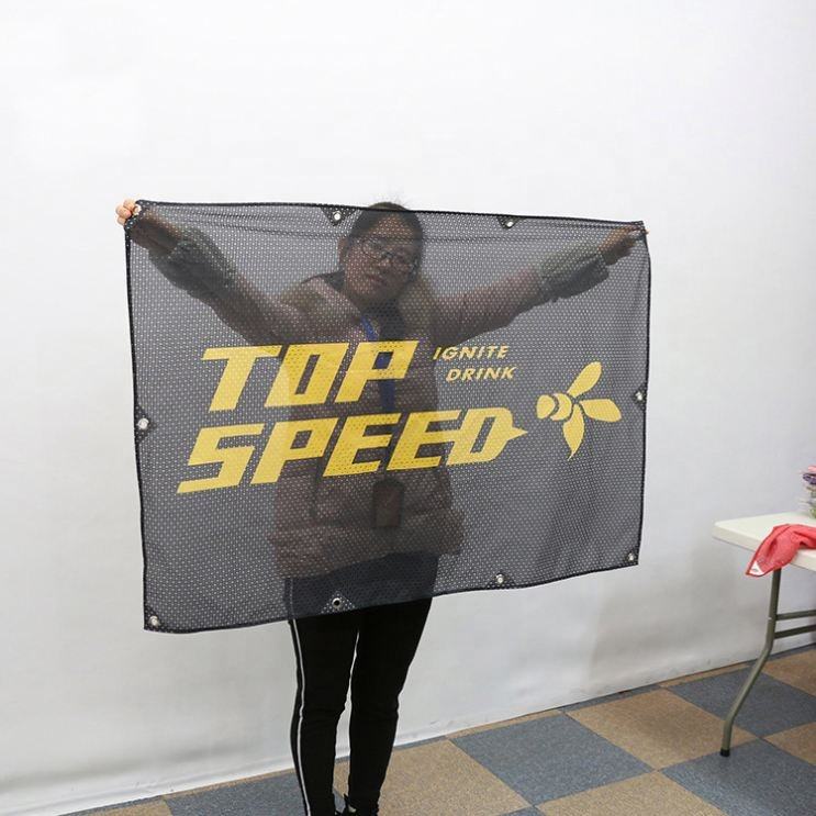 รั้วผ้าพิมพ์กันน้ำสำหรับกิจกรรมกลางแจ้งสำหรับธุรกิจแบนเนอร์โฆษณาตาข่ายโพลีเอสเตอร์กำหนดขนาดได้เอง